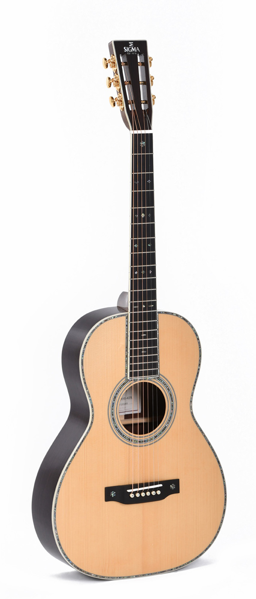 It stands out for its solid Adirondack spruce top, solid Indian rosewood back and sides, ebony fingerboard, bone nuts and saddles, and gold open-gear Grover tuners.