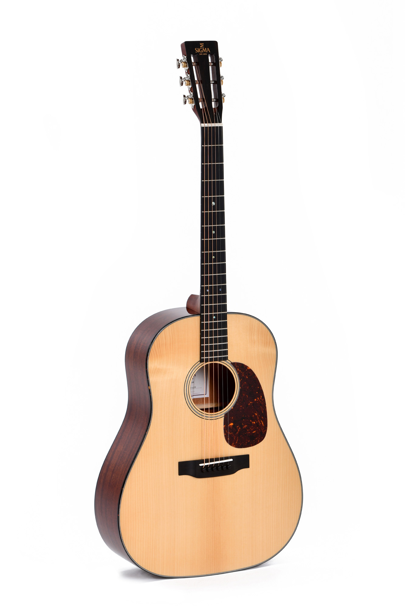 SDJM-18 model, Dreadnought body shape, solid spruce top, solid mahogany back and sides, ebony fingerboard, slotted headstock, gloss natural finish, with soft case.