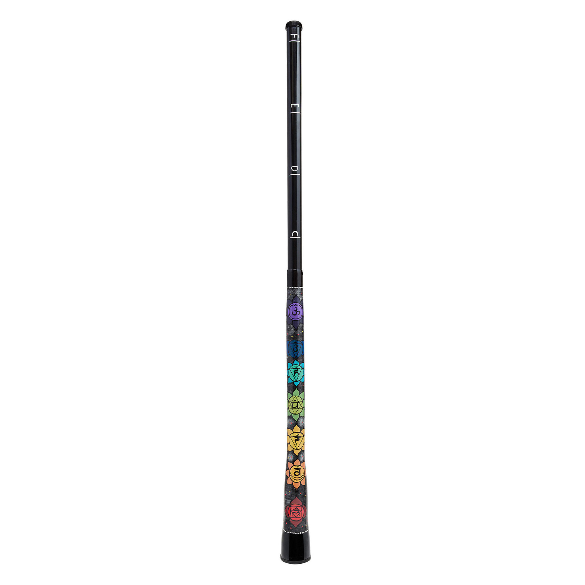 Synthetic instrument tuned to C, D, E, and F, offering deep tones and a symbolic dimension linked to the chakras. Its adjustable length from 100 to 180 cm makes it suitable for different uses. Each tone is associated with a hand-painted chakra symbol: C for the root chakra, D for the sacral chakra, E for the solar plexus chakra, and F for the heart chakra.