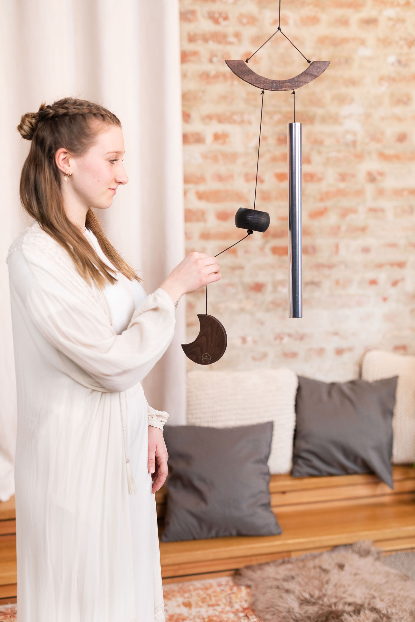 This product is presented under the name Chimes Sonic Energy Moon 35", Silver. Its silver finish gives it a simple and elegant look.