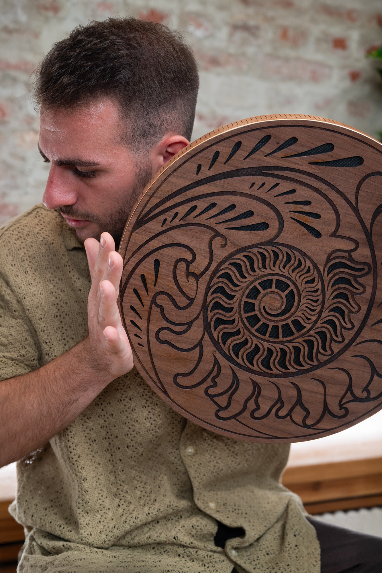 This walnut sound disk is designed with a sculpted surface to produce soothing sounds reminiscent of water. With a diameter of 38.10 cm and a height of 3.4 cm, it offers a harmonious presence and a format suited to comfortable use. It comes with a soft bag and a wooden stand for neat storage and presentation.