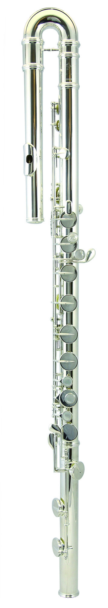 This bass flute features a curved headjoint, body, and keys in silver-plated nickel silver, as well as a sterling silver lip plate and riser. It comes with closed-hole keys and a low C footjoint, and is delivered in a hard case with a case cover.