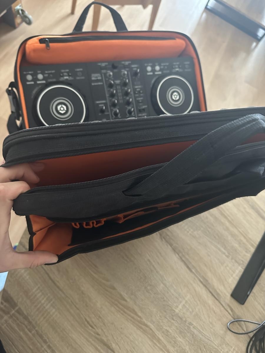 Avec housse de rangement/transport, un espace pour les platines, un pour l’ordinateur et un pour le reste du matériel.