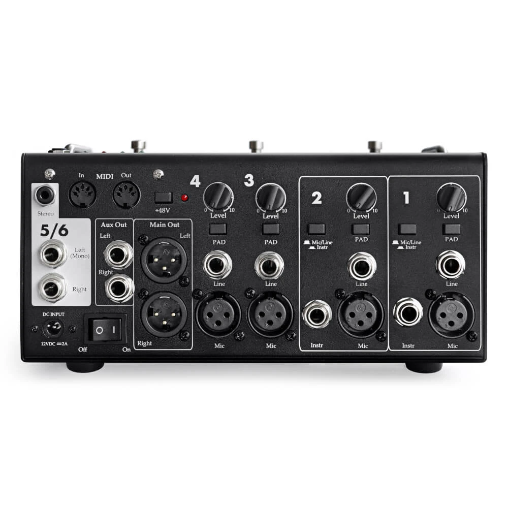 Connection options include XLR and 6.35 mm inputs for channels 1–4, stereo jack inputs for channels 5/6, AUX in/out, main XLR outputs, and MIDI In/Out, ensuring compatibility with a wide range of devices and configurations. Developed and manufactured in the USA, the Stompmix X6 stands out as a mixing solution that redefines flexibility, portability, and performance for musicians and audio professionals alike.