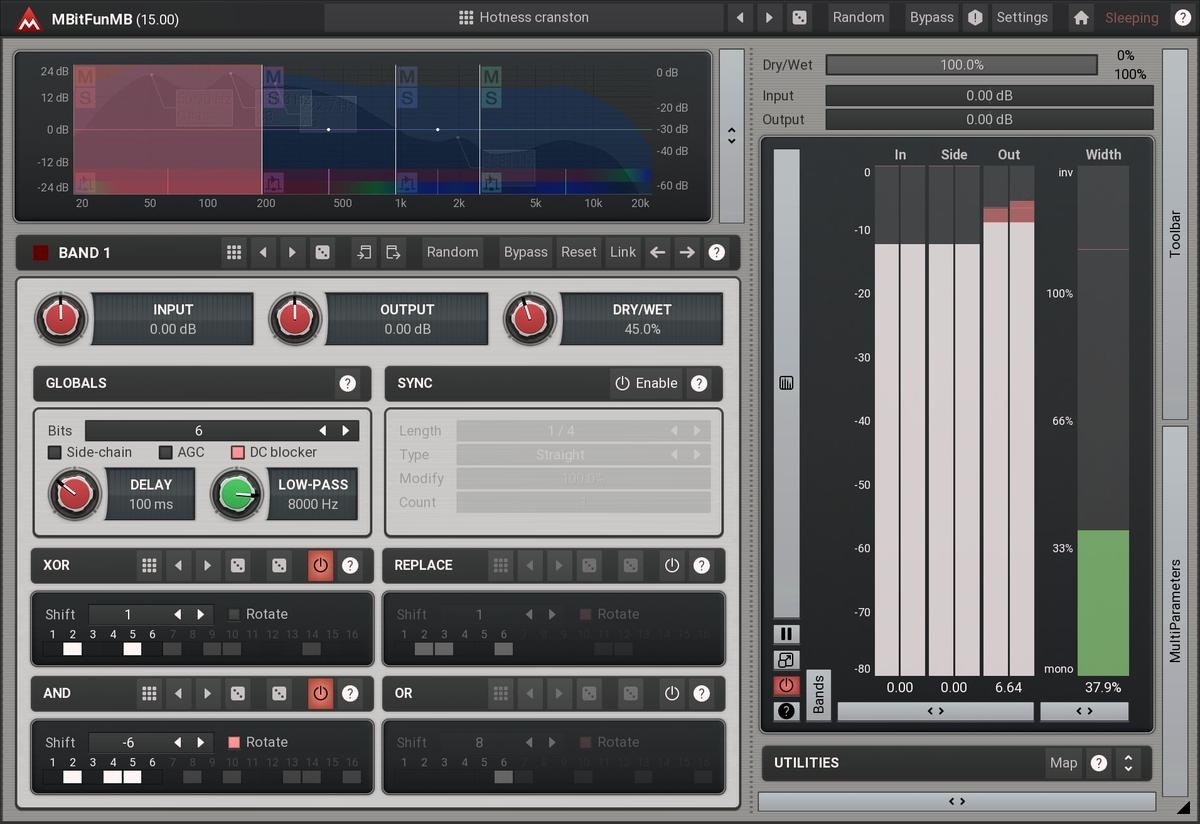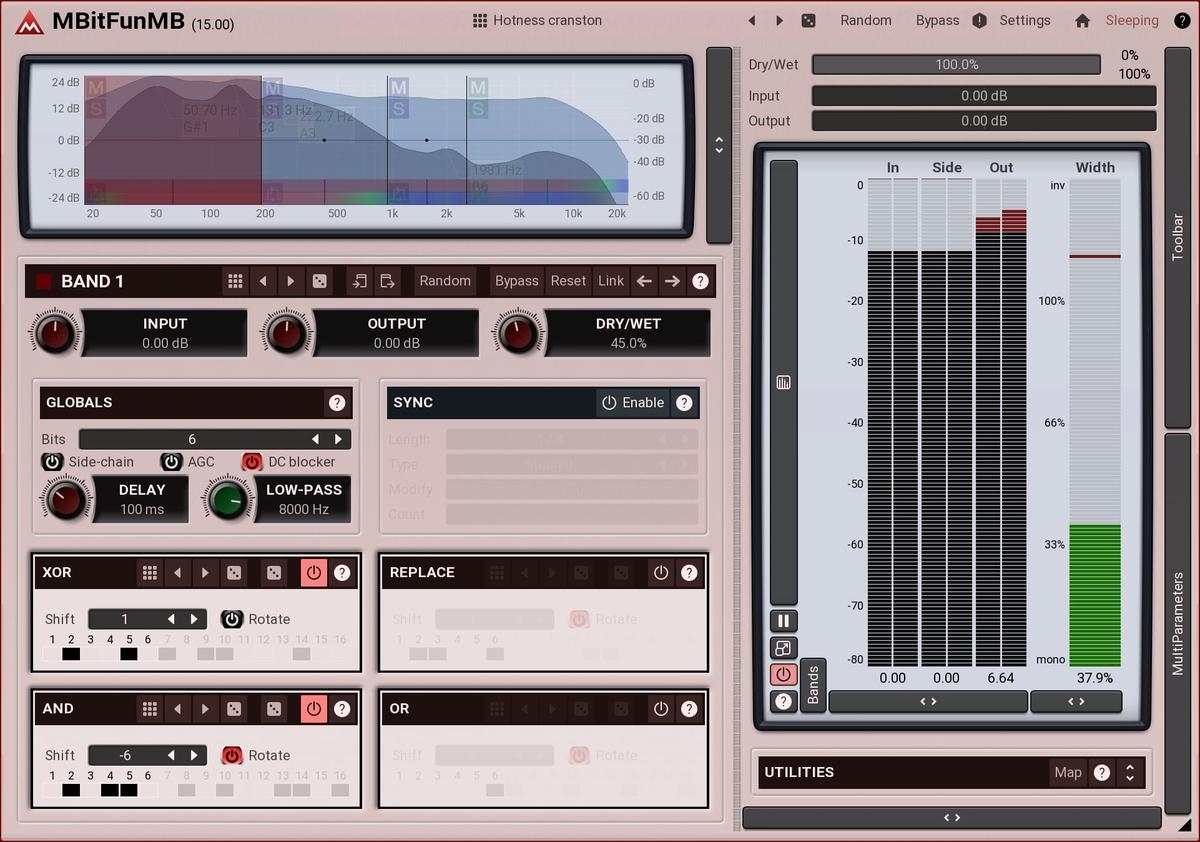 MBitFunMB is a serious tool for extreme distortion lovers. It converts the incoming audio into limited fixed-point precision data of 1-16 bits per sample and lets you access each bit with several bit-manipulation operations and finishes the processing with a low-pass filter. All with up to 6 independent frequency bands, 4 modulators...