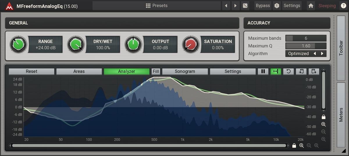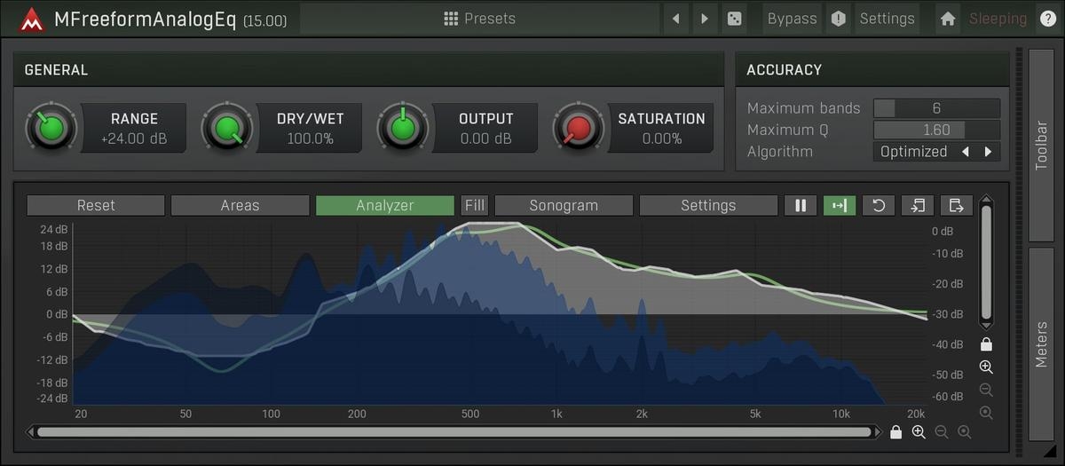 Parametric equalizers may sound great, but they can be obtuse to use. MFreeformAnalogEq is simple. Just draw the equalization that you want and MFreeformAnalogEq will make it happen with the high audio quality of parametric analog filters!