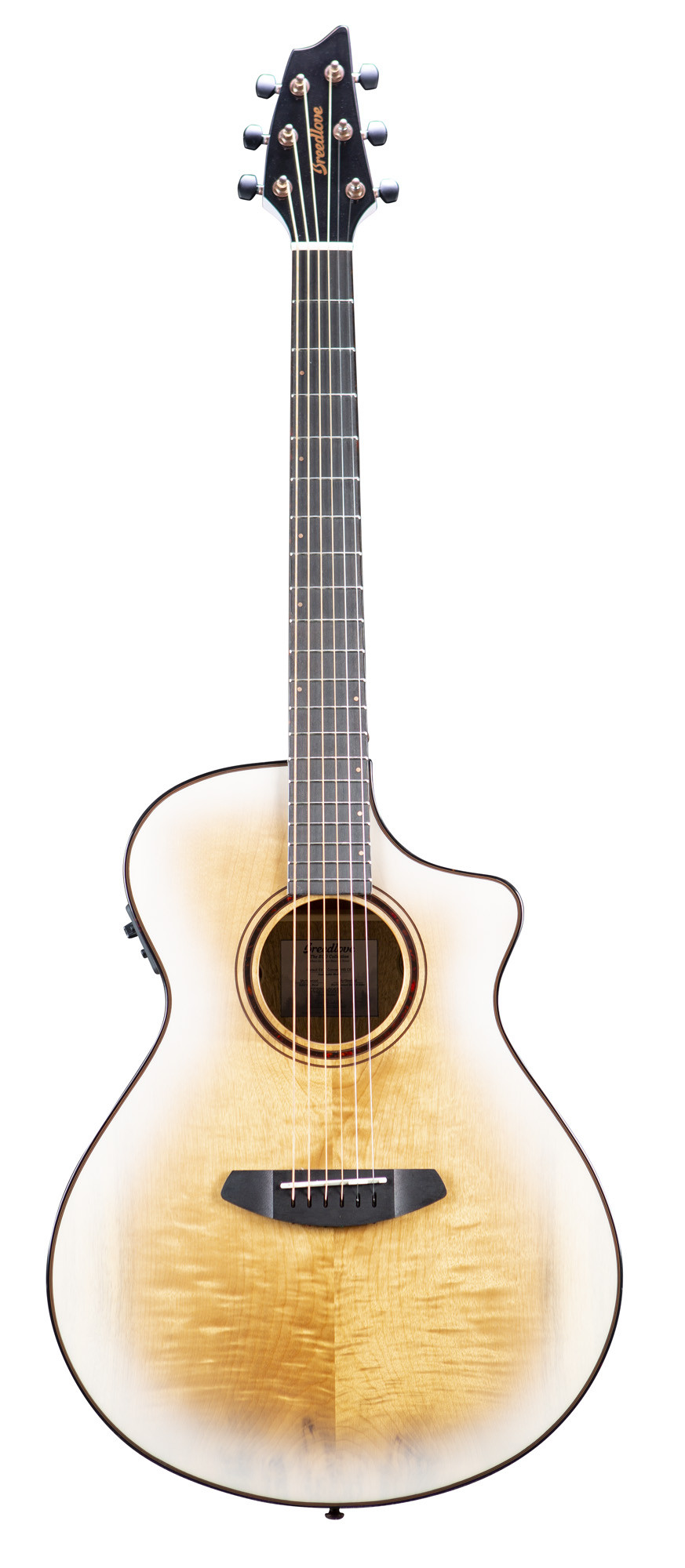 It is equipped with a mahogany neck, an ovangkol fingerboard and bridge, as well as 20 frets and a 43 mm nut width. The brass offset dots inlays, tortoise rosette and tortoise binding add a refined finish. Tusq nuts, Breedlove Premium Copper tuning machines and D'Addario XT PB Light strings complete the package. On the amplification side, it features a Fishman Presys I EQ.