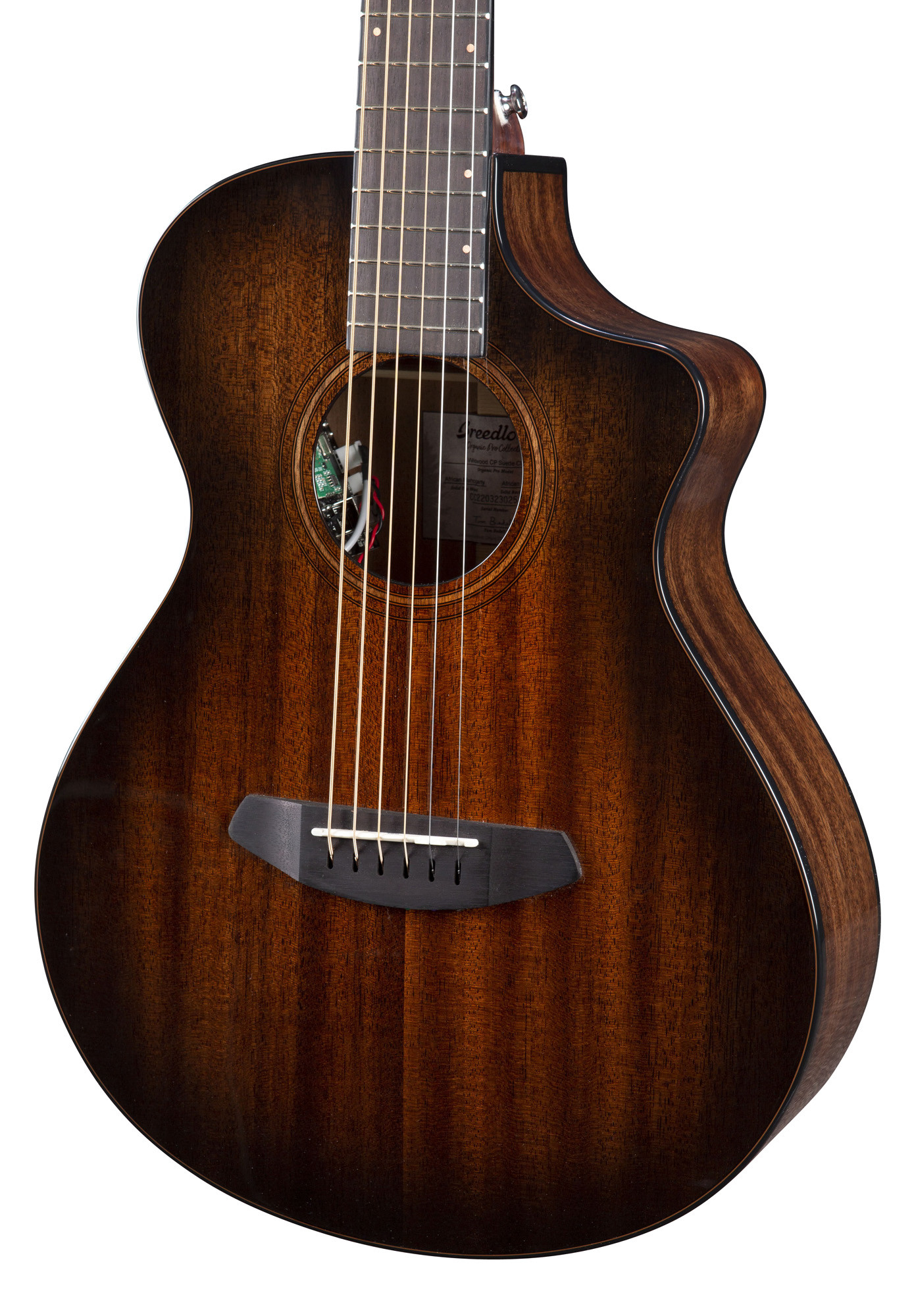 Its quality is based on a solid mahogany top, back and sides, a mahogany neck, an ovangkol fingerboard and bridge, as well as finishing and hardware components such as Tusq nuts, Premium Breedlove tuners and the Fishman Flex Plus-T preamp.