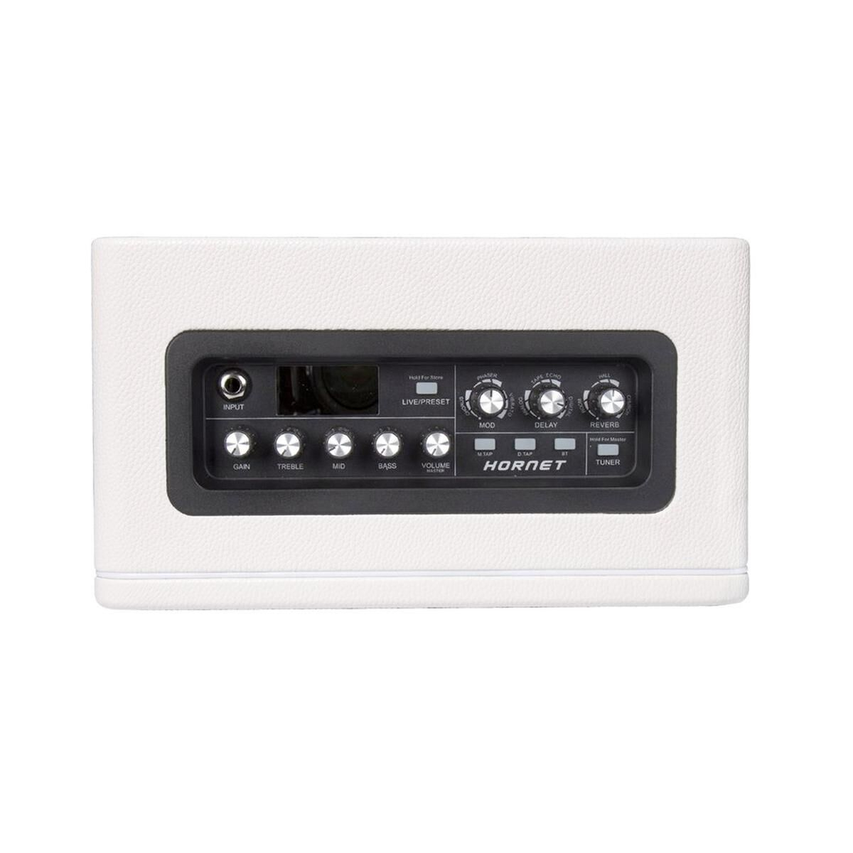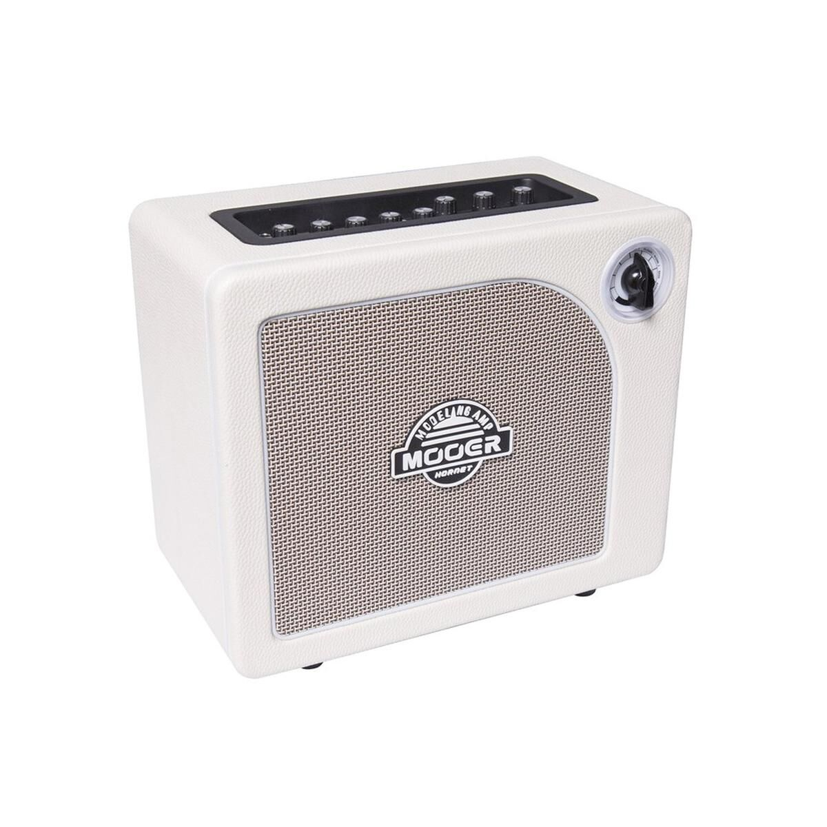 This Mooer Hornet White 15W amp is ideal for guitarists and bassists of all levels, whether they are beginners or professionals, seeking a compact, versatile, and easy-to-transport amp for practice at home, in the studio, or for small performances.