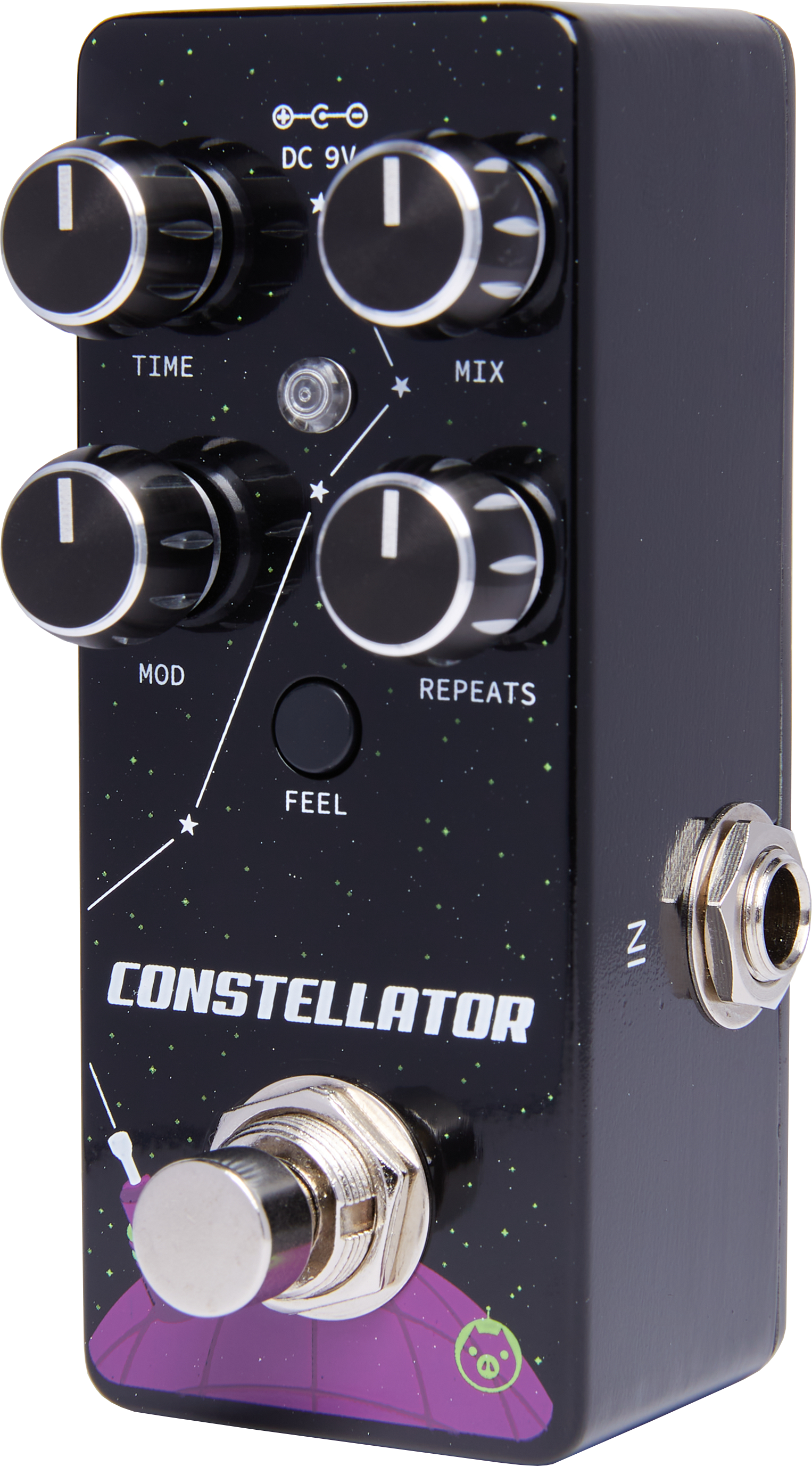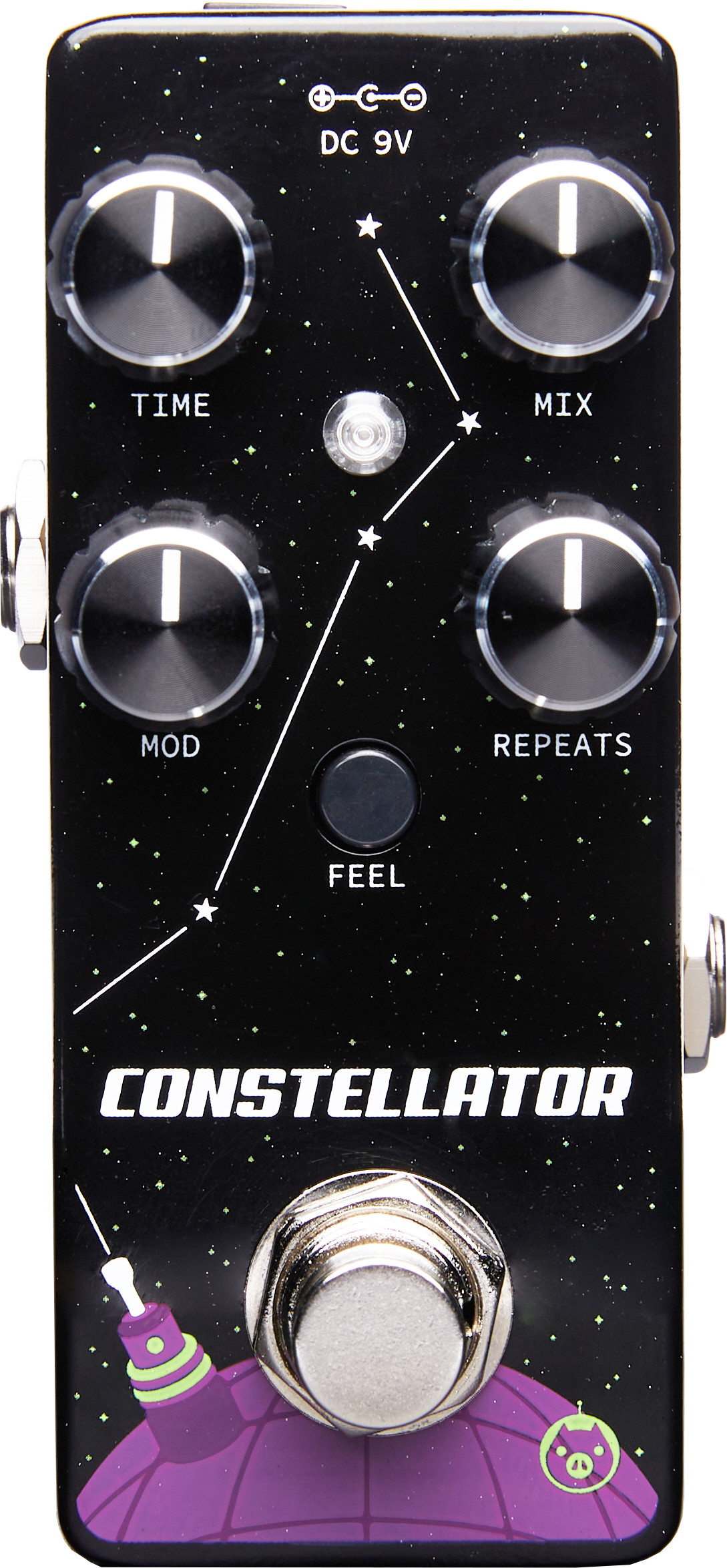 The Constellator is a fully analog delay pedal capable of producing up to 600 ms of lush echo with adjustable modulation and a full sonic range. From percussive slapback and doubler sounds to long chorused delays with endless repeats, the Constellator’s MN3005 bucket brigade chips offer greater overall headroom and a tape-like saturation when pushed to the limit. The Feel toggle switch adjusts several parameters simultaneously for additional LFO modulation coloration. With the Feedback control at maximum, the Constellator is capable of self-oscillation, which can be increased or decreased by turning the Time knob. Operates on standard 9VDC power.