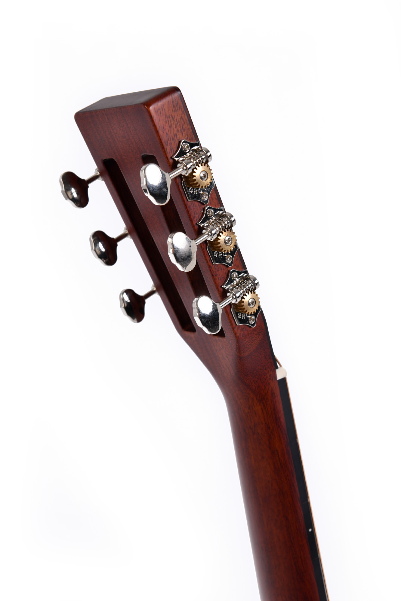 Its solid Adirondack spruce top, solid mahogany back and sides, ebony fingerboard, bone nut and saddle, and nickel-plated open-gear Grover tuners highlight high-quality materials and components.