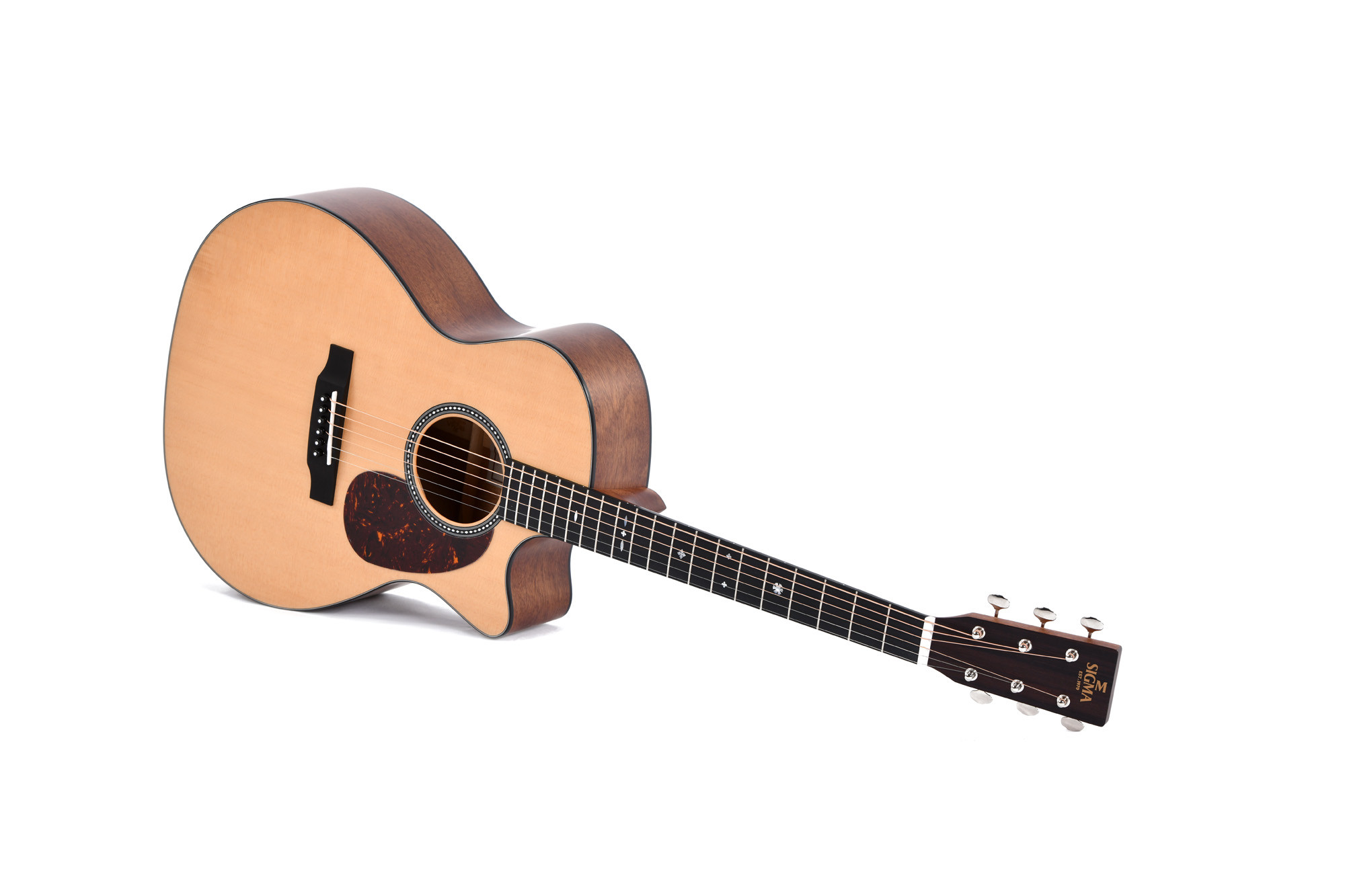 Sigma Serie Crossroad Sgmc-10e is a Grand OM cutaway model designed to offer a good balance between playing comfort, projection, and versatility. Its solid Sitka spruce top, combined with the solid mahogany back and sides, contributes to a clear, precise, and warm sound. The mahogany neck, micarta fingerboard, and bone nut and saddle provide a comfortable feel and careful craftsmanship. Equipped with an LR Baggs EAS-VTC EQ system, it is suitable for both acoustic playing and amplification. The package comes with an SSC-G soft case.