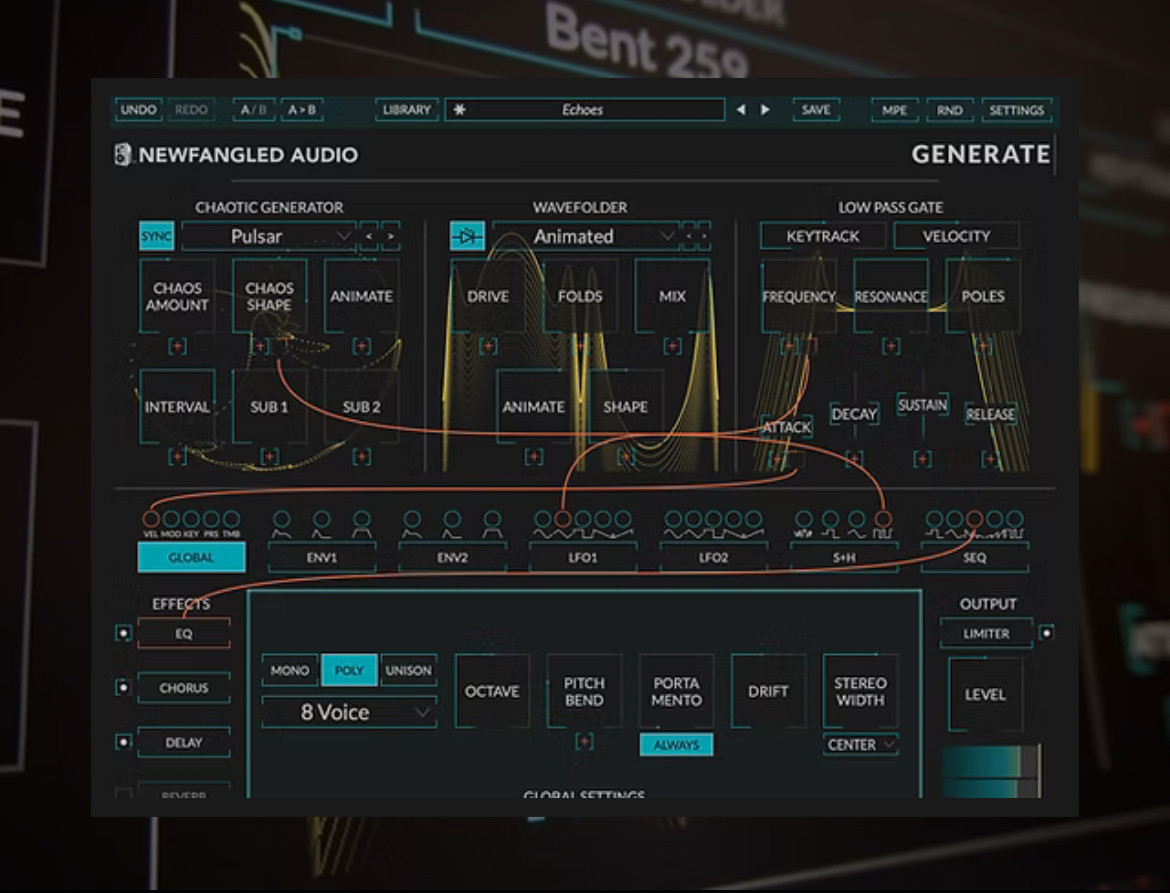 Generate is based on a set of chaotic generators. What looks like randomness contains underlying patterns, interconnectedness, constant feedback loops, repetition, self-similarity, fractals, and self-organization. Each of Generate’s 8 chaotic generators bring out these underlying patterns and create an oscillator that can smoothly fade from a sine wave to total chaos, with an expanse of territory to explore in between. The musical textures created include distortion, harmonics, grunge, static, and noise. All of which can be predictably or unpredictably modulated.