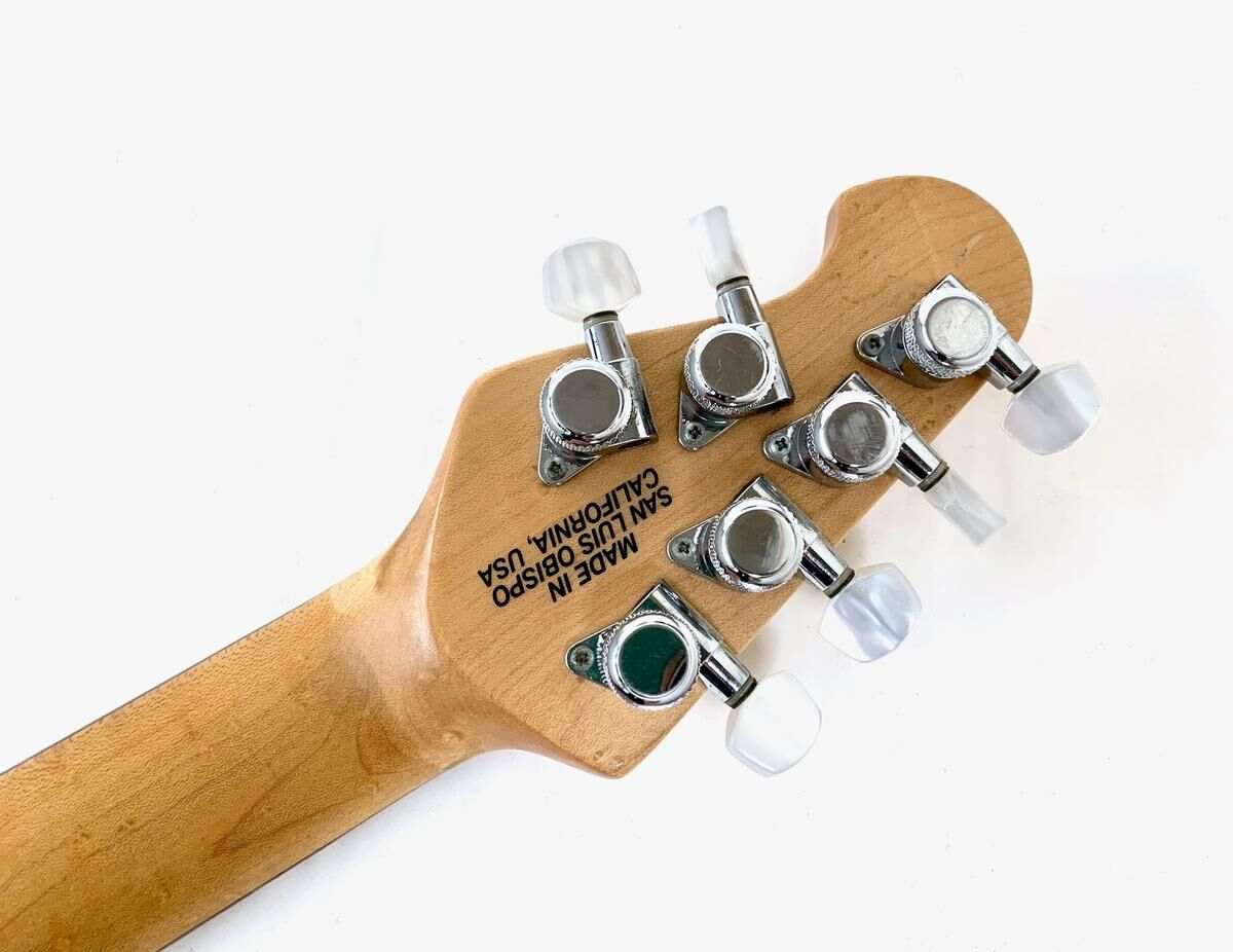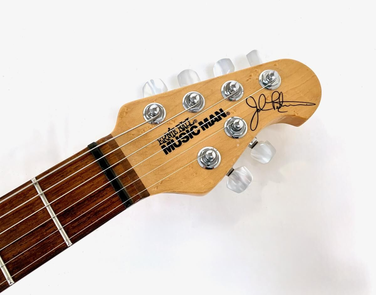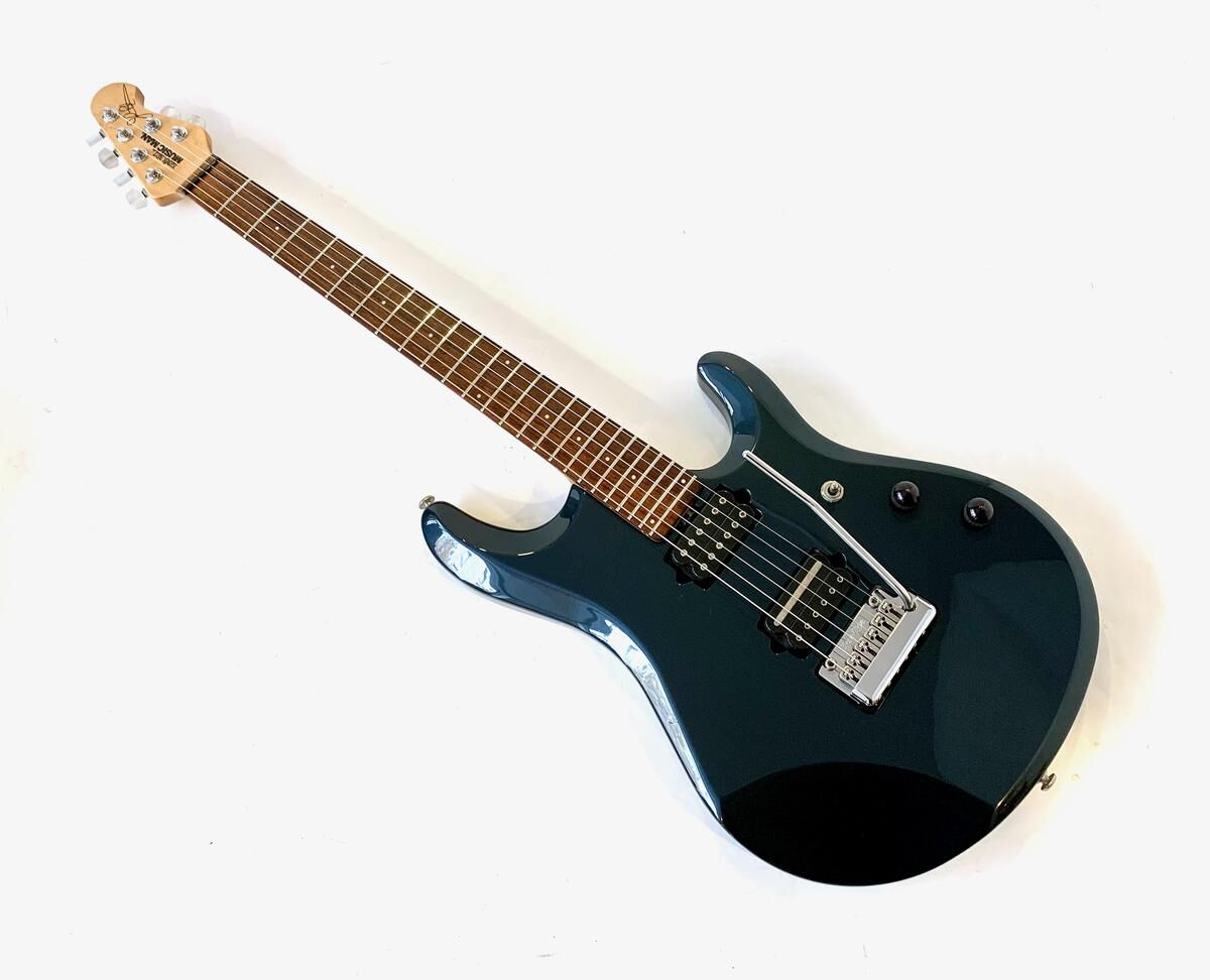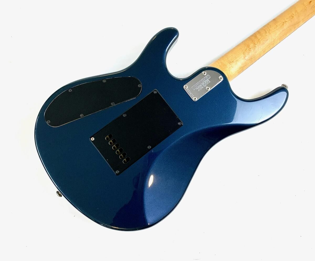 Cette MusicMan signature Petrucci (Dream Theater) est dotée de DiMarzio : des dérivés du AirNorton en position manche et du D Sonic en chevalet. De couleur Carbon Blue Pearl, son manche en érable se dote d'une touche en palissandre avec 24 frettes. Vendue dans son étui d’origine.