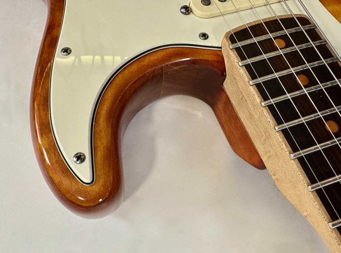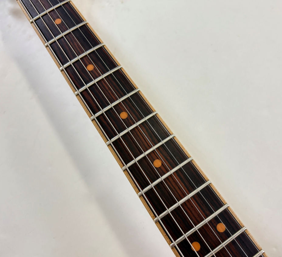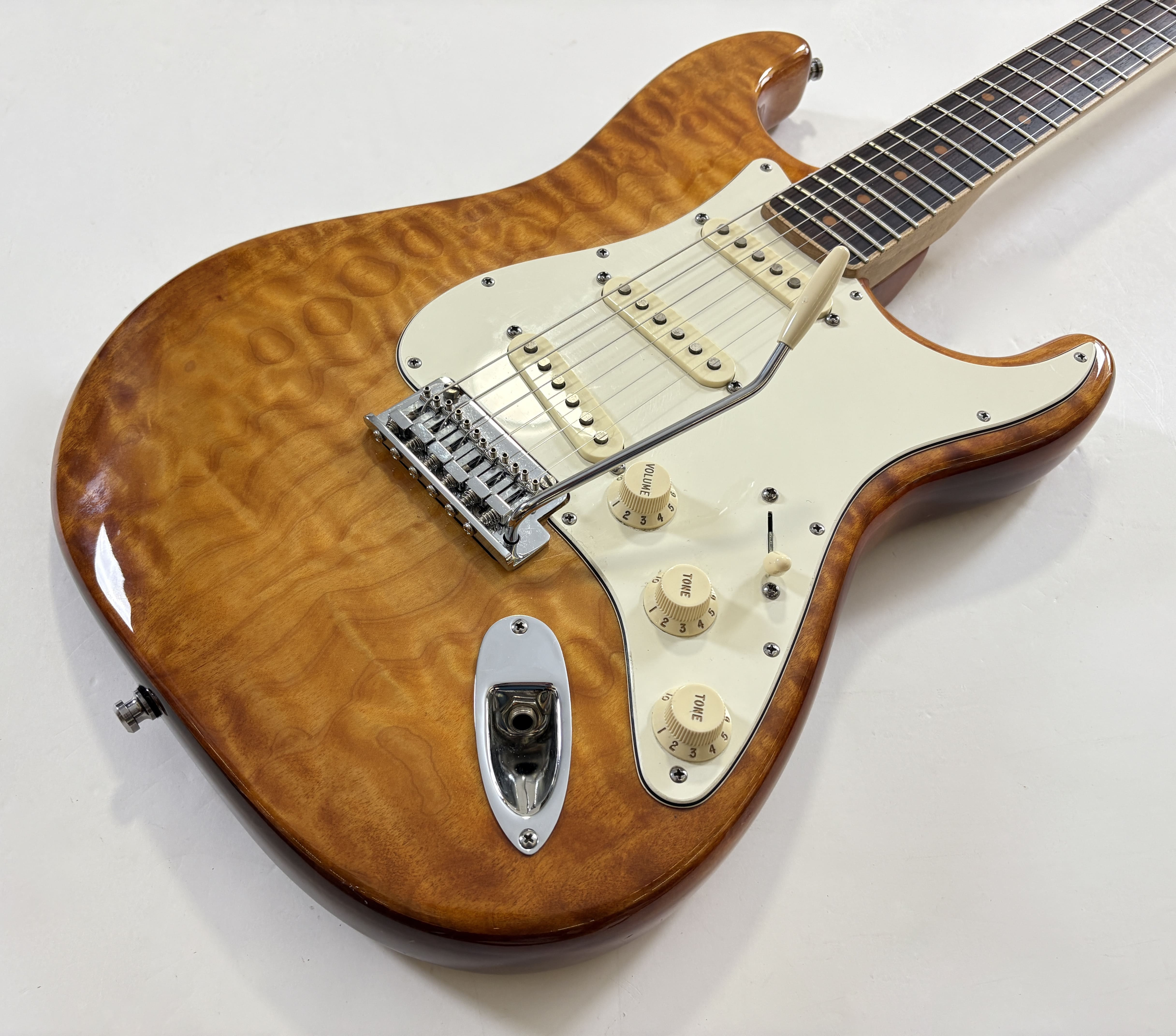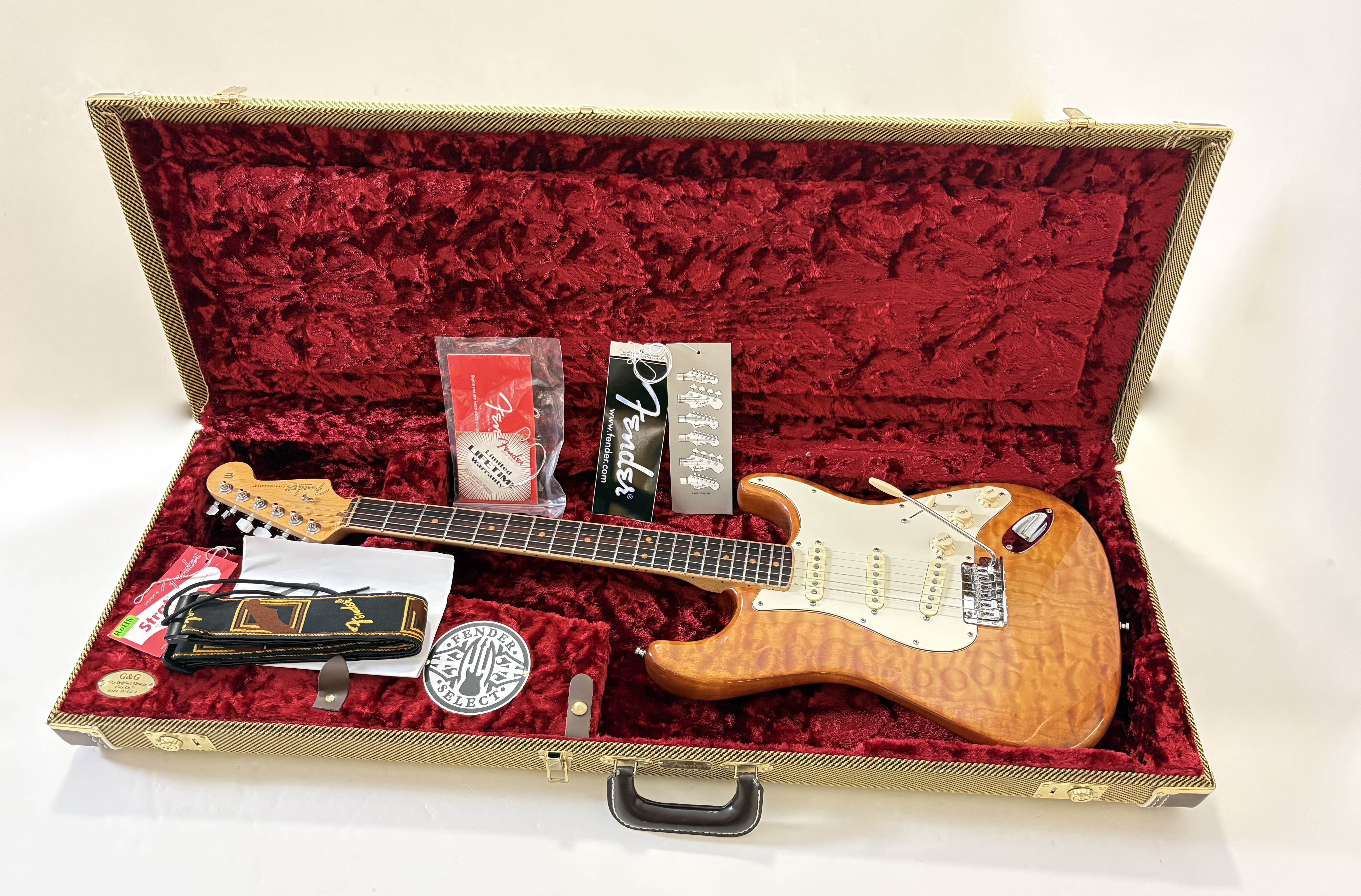 This Stratocaster from the Select series features particularly carefully selected woods. The alder body is topped with a stunning AAA-grade pommele (figured) maple cap. The maple neck, with a Modern C profile, is equally impressive, featuring a birdseye figure and a channel-bound rosewood fingerboard with a compound radius of 9.5 to 14 inches. Part of a limited edition, this Fender is in excellent condition and comes with its original tweed case. More pix and details upon request. Shipping worldwide available.
