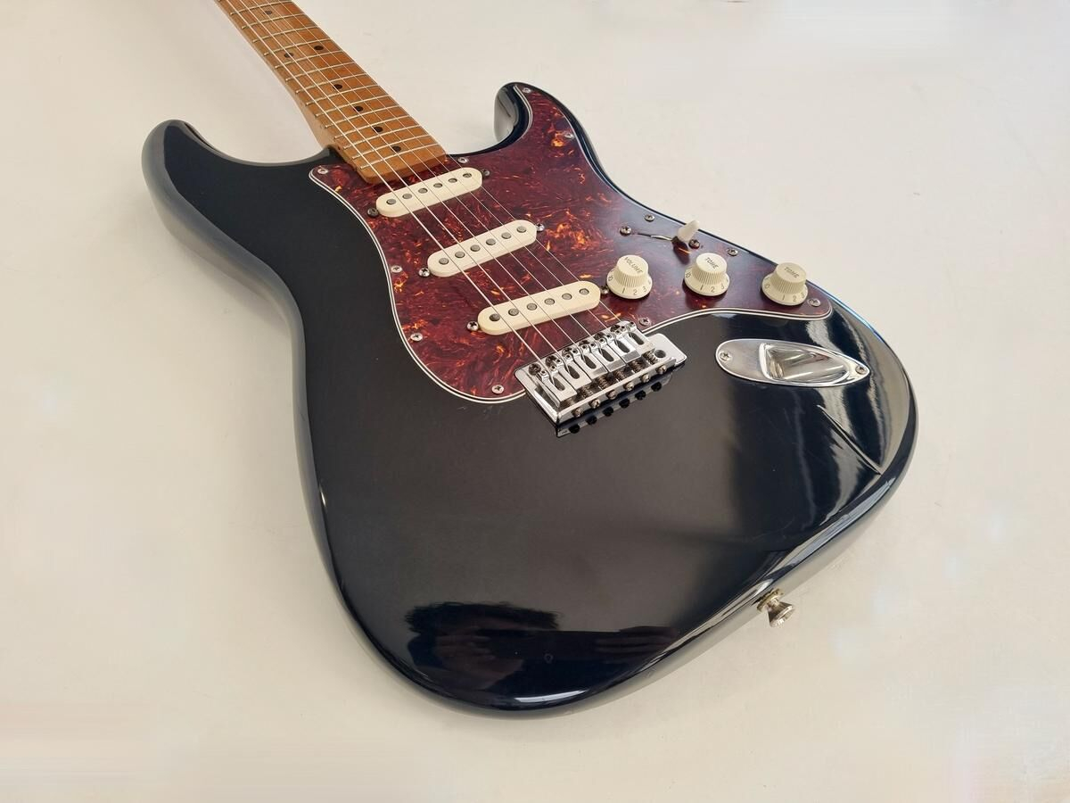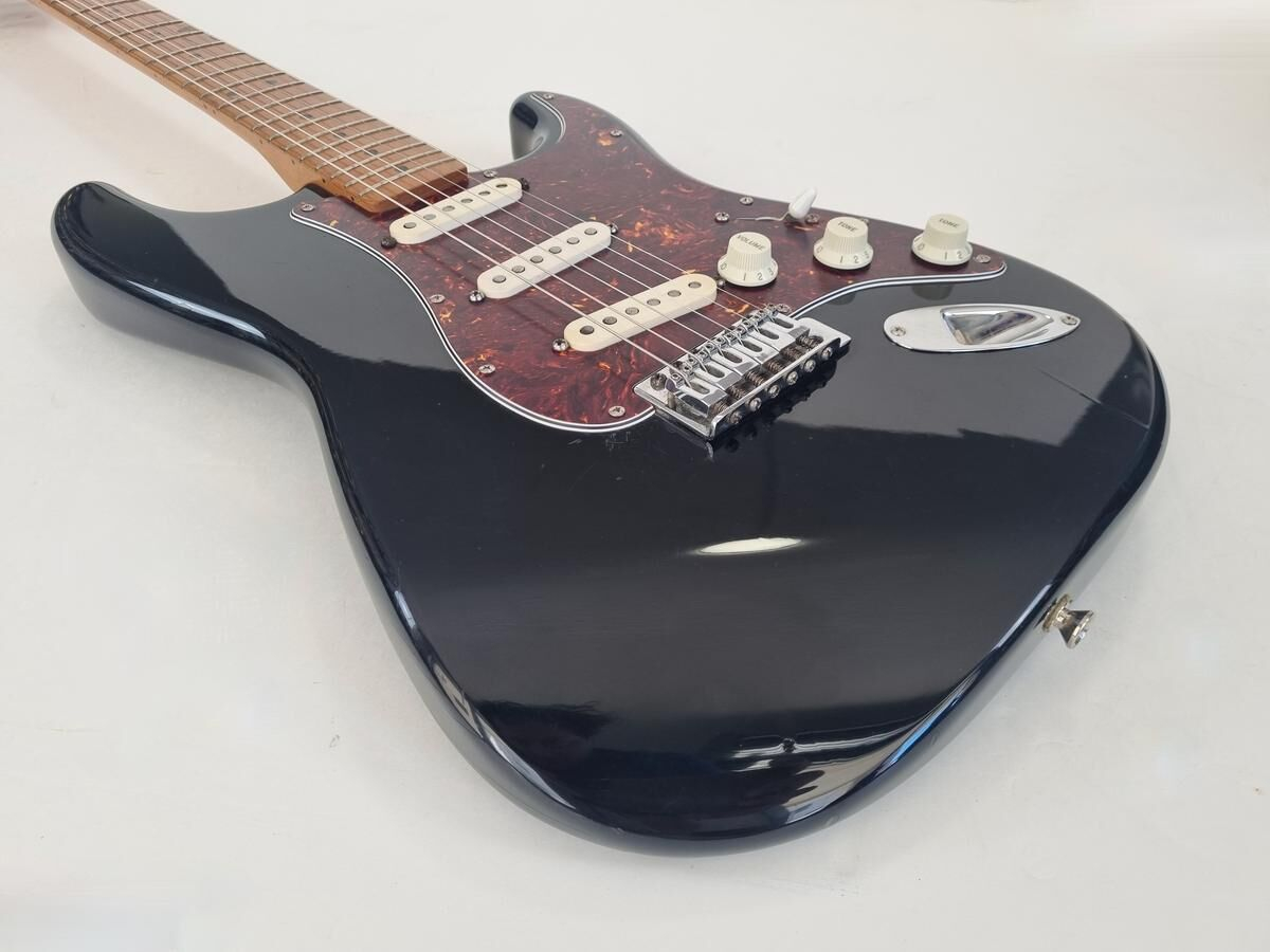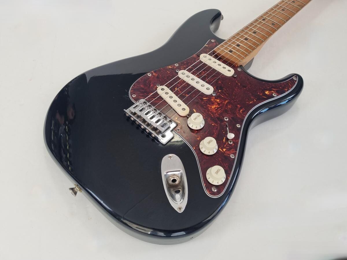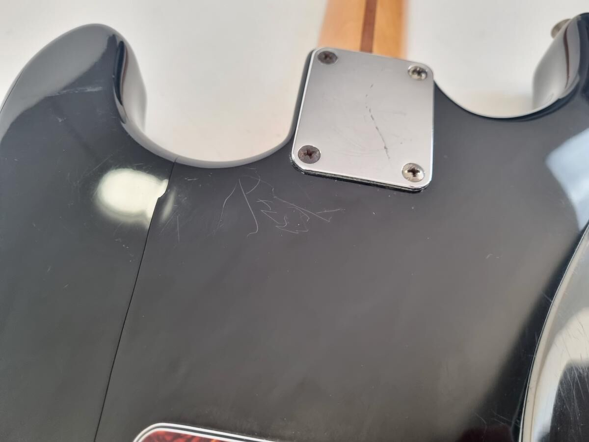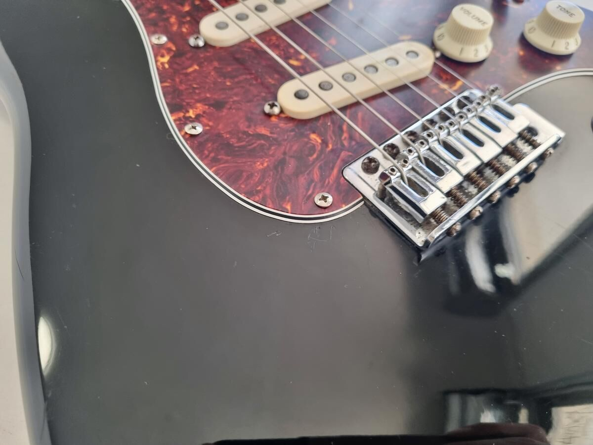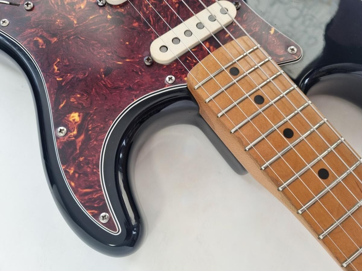 Un classique de la gamme Fender, manche modern C, radius de 9.5 pouces et touche érable, cette Strat est très confortable à jouer. Le pickguard tortoise combiné à la couleur noire lui donne un super look ! Elle a de nombreuse marques d'usage.