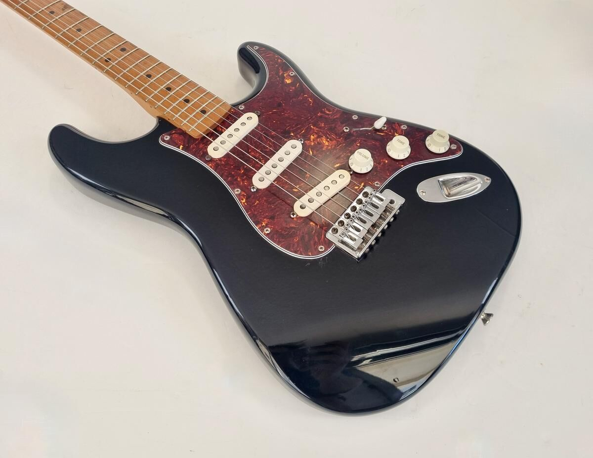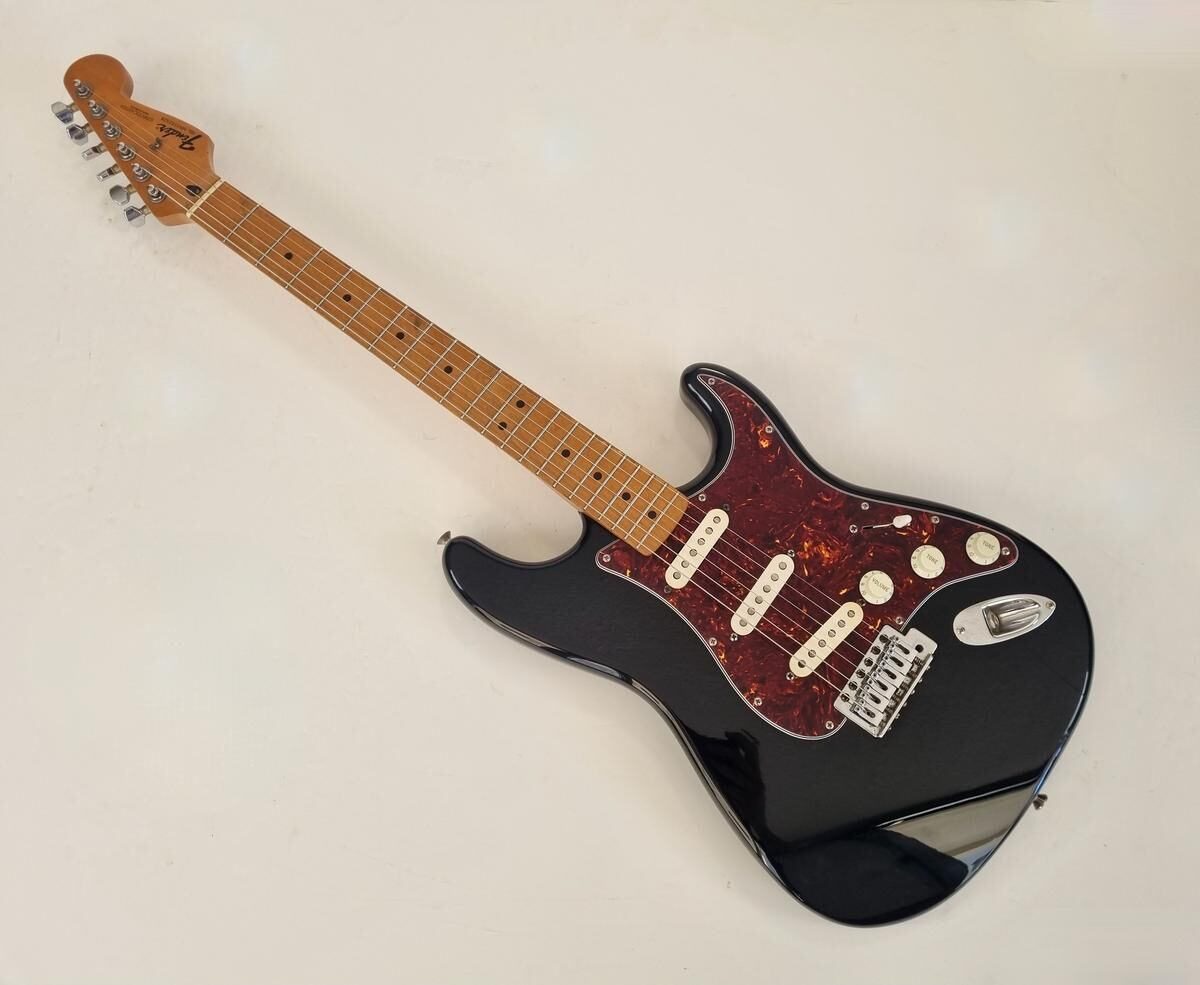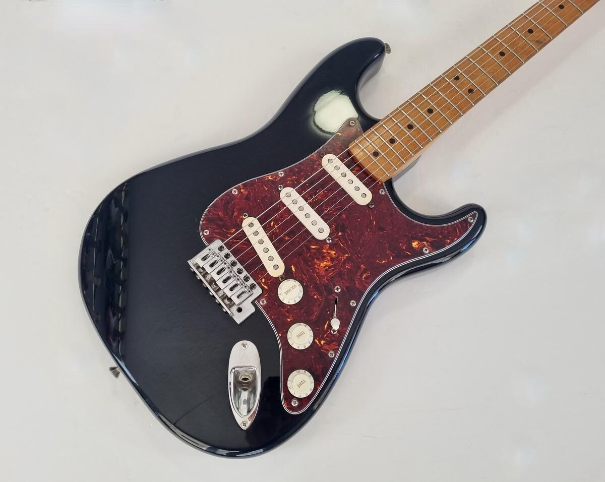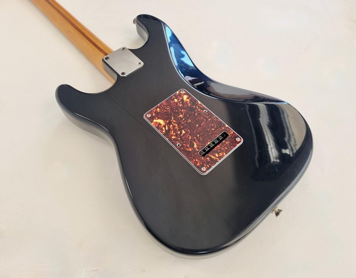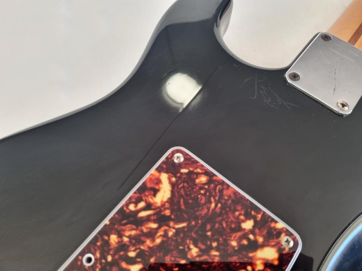 Un classique de la gamme Fender, manche modern C, radius de 9.5 pouces et touche érable, cette Strat est très confortable à jouer. Le pickguard tortoise combiné à la couleur noire lui donne un super look ! Elle a de nombreuse marques d'usage.