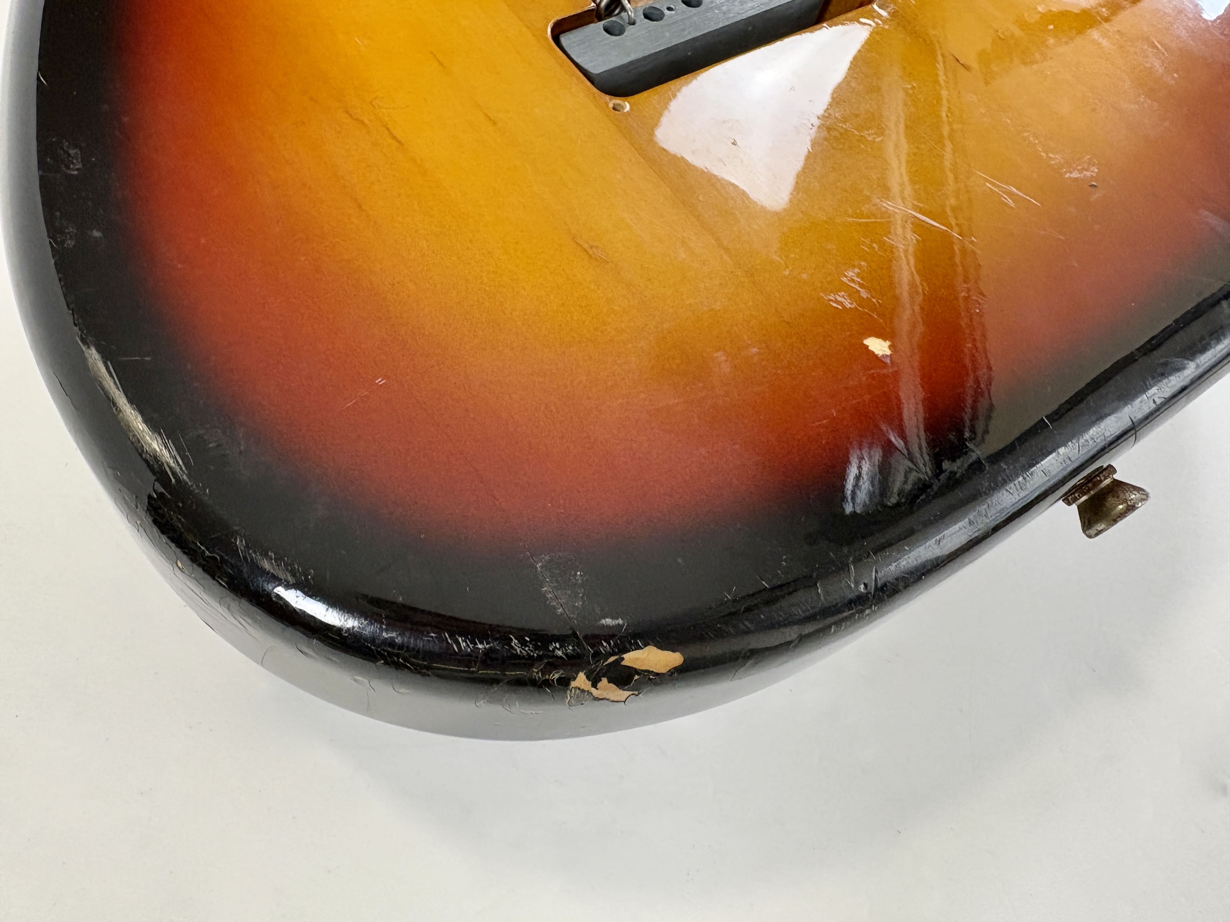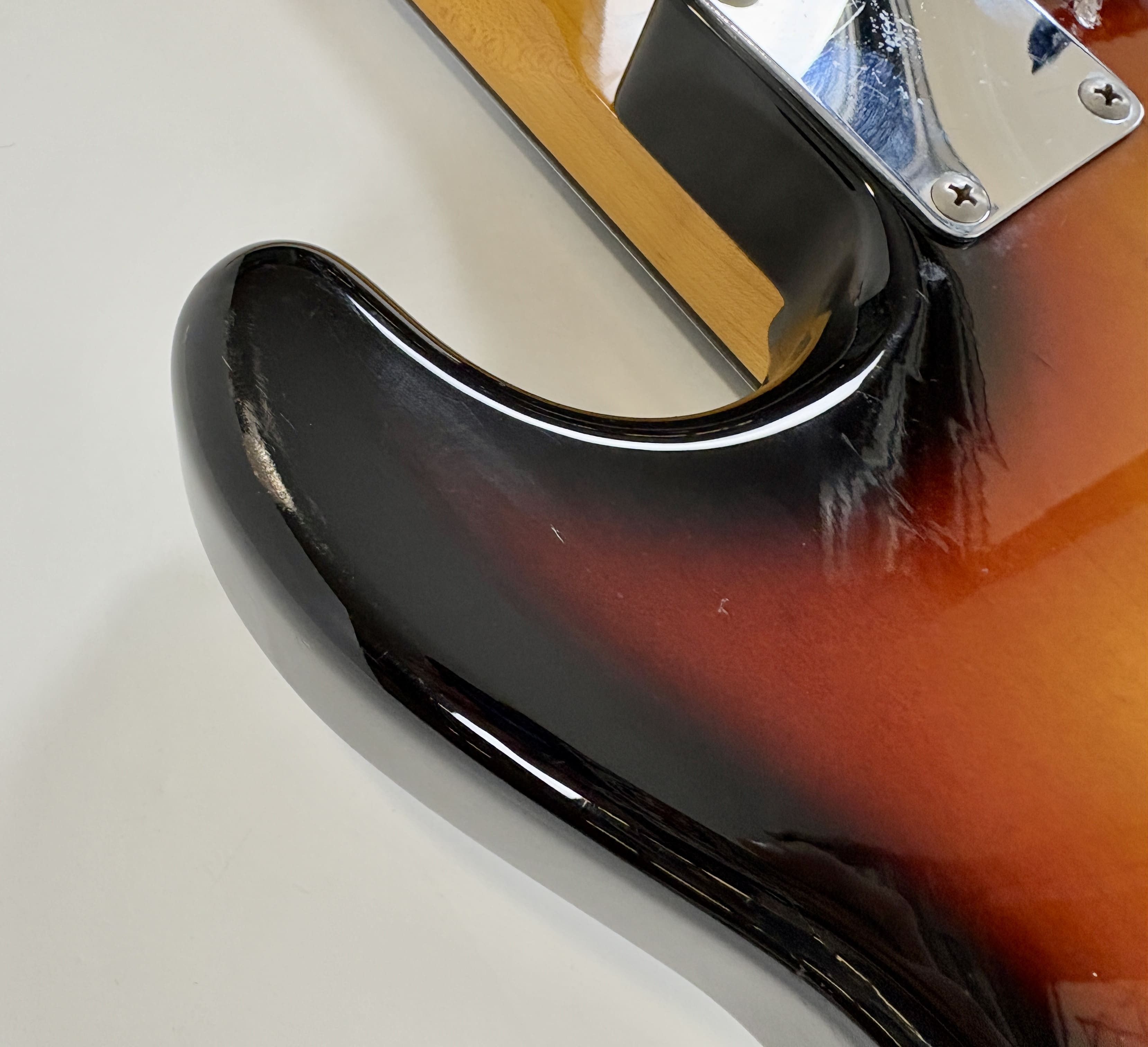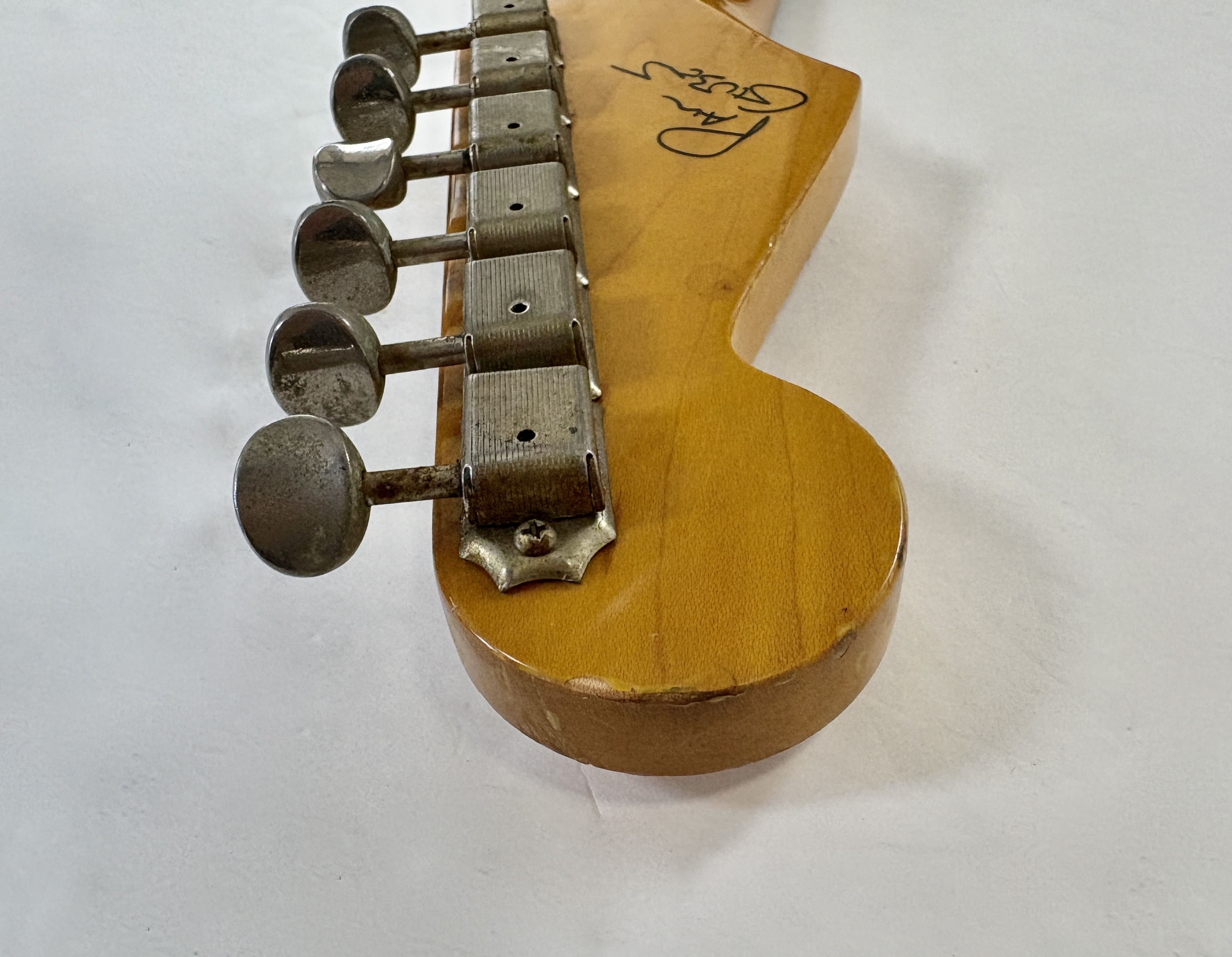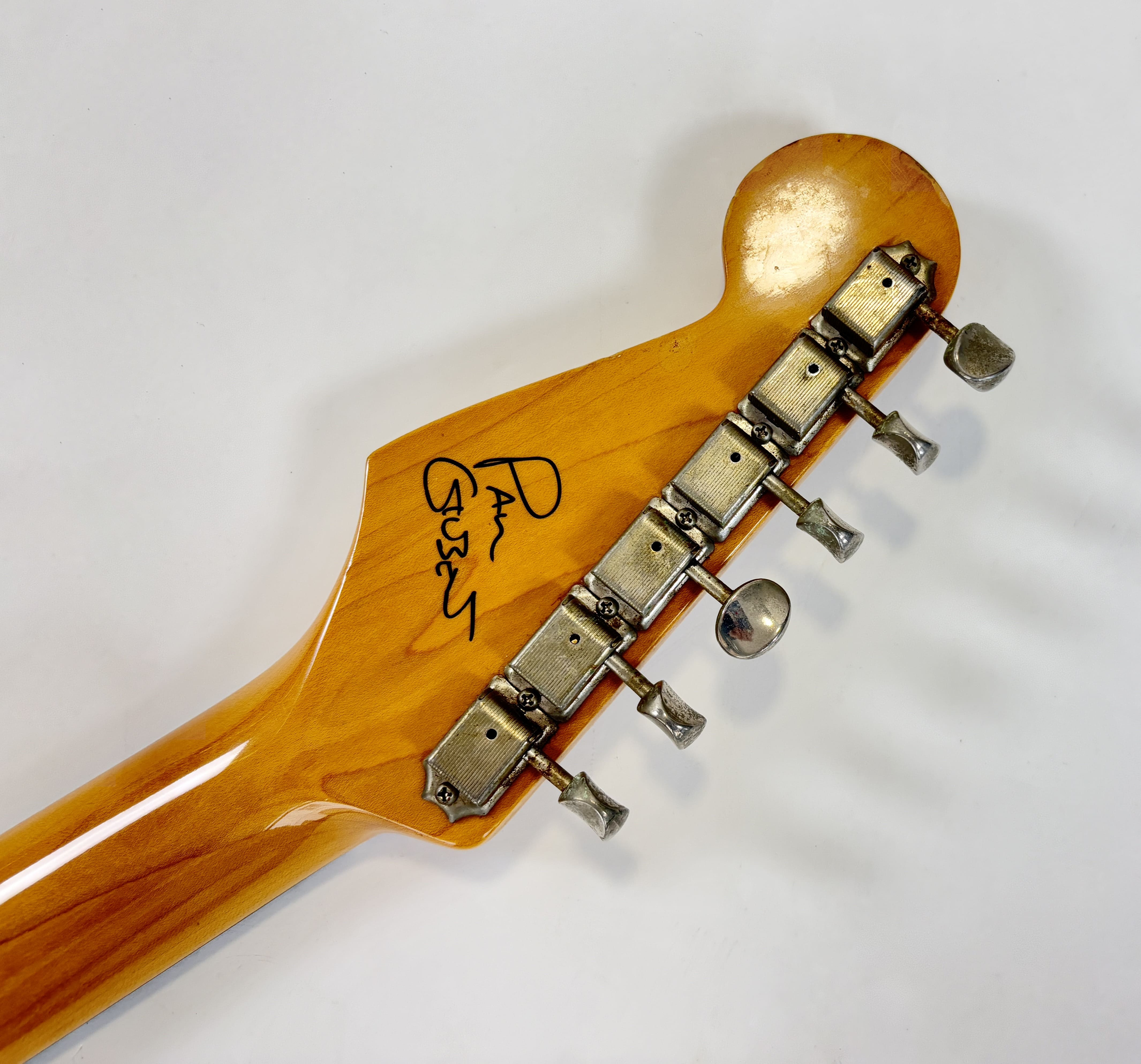 As usual, this Strat—built between 2004 and 2005—features the typically flawless Japanese craftsmanship and assembly. The pickups are tastefully Fender made in USA ‘black bottom’ units, with a Seymour Duncan SHR-1B Hot Rails (single-coil-sized humbucker) in the bridge position. The potentiometers have also been upgraded to CTS. A reproduction of the 1962 model, it features a maple neck with a thick slab rosewood fingerboard. The back of the headstock has been signed by Paul Gilbert.