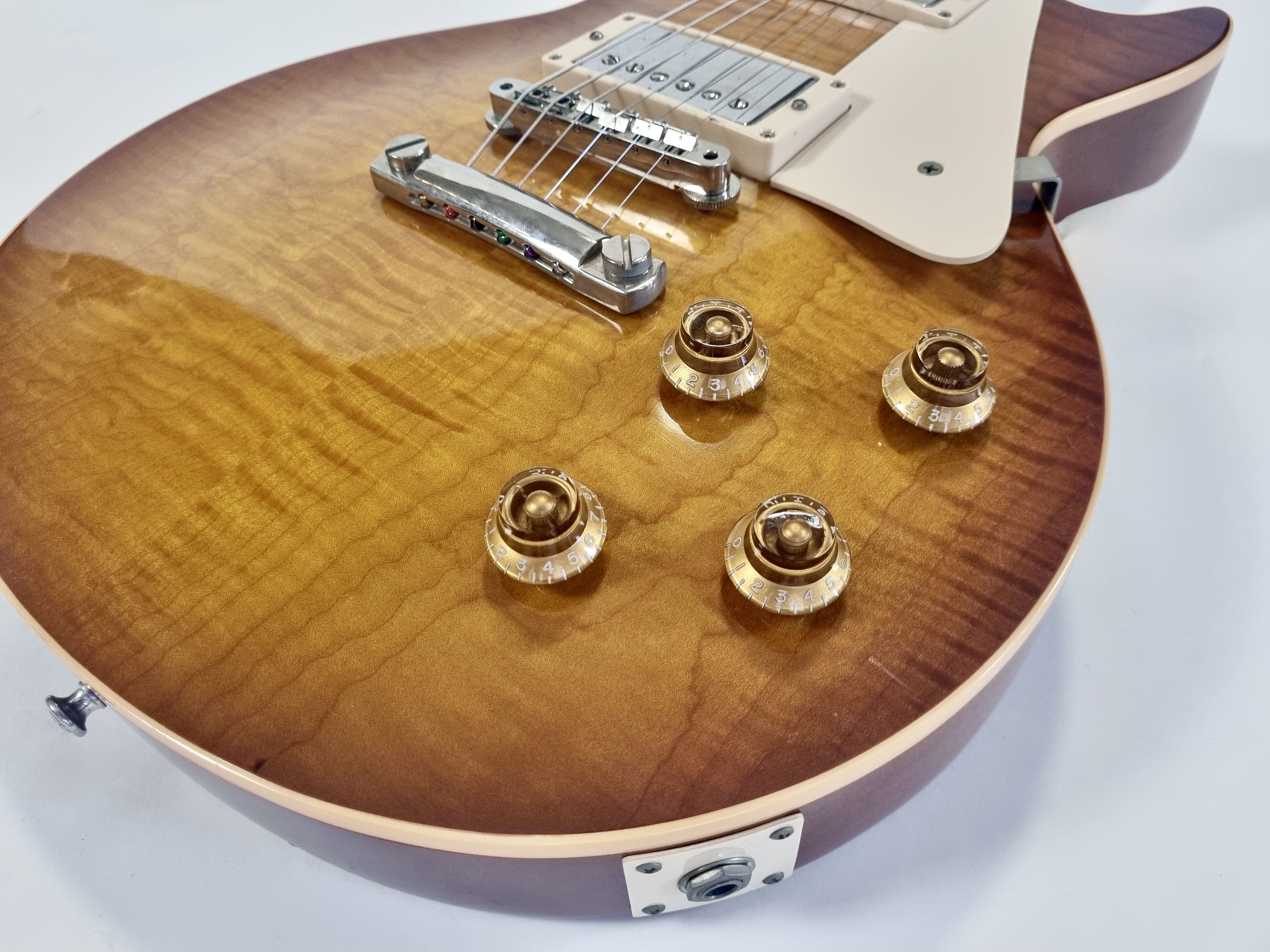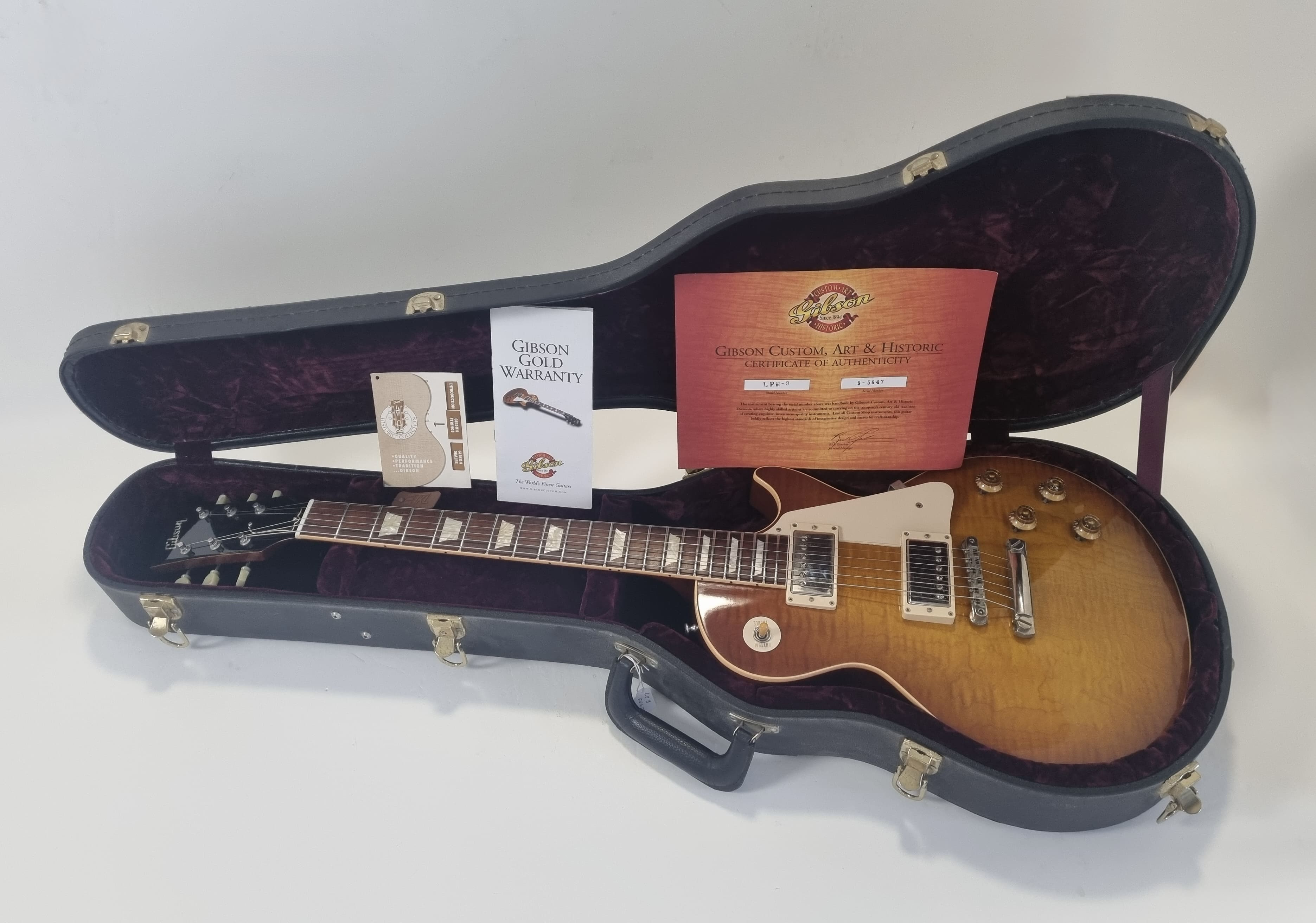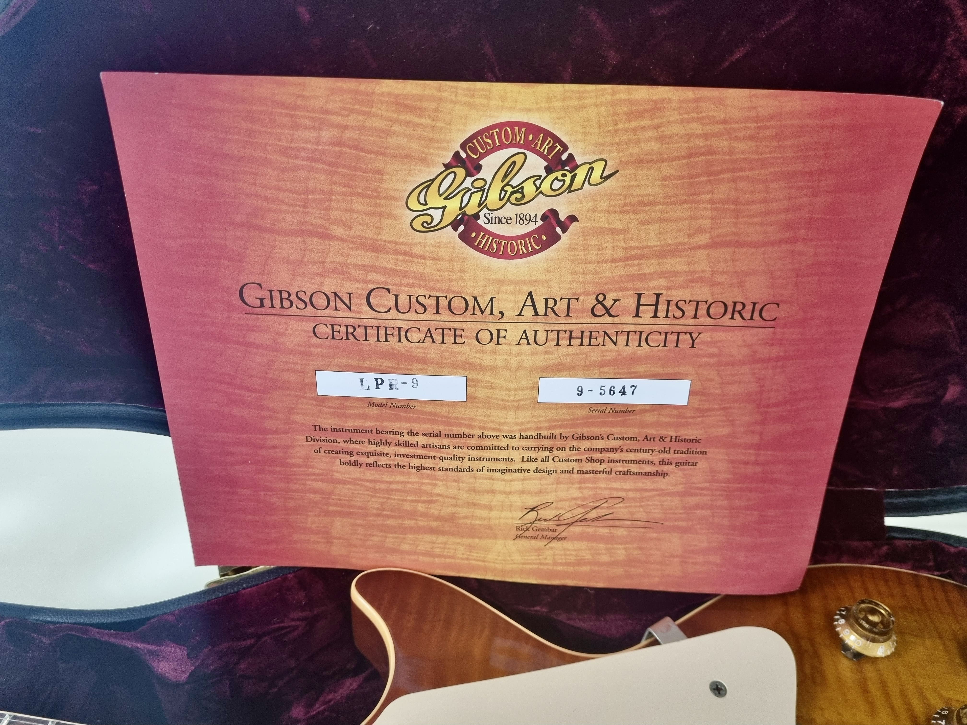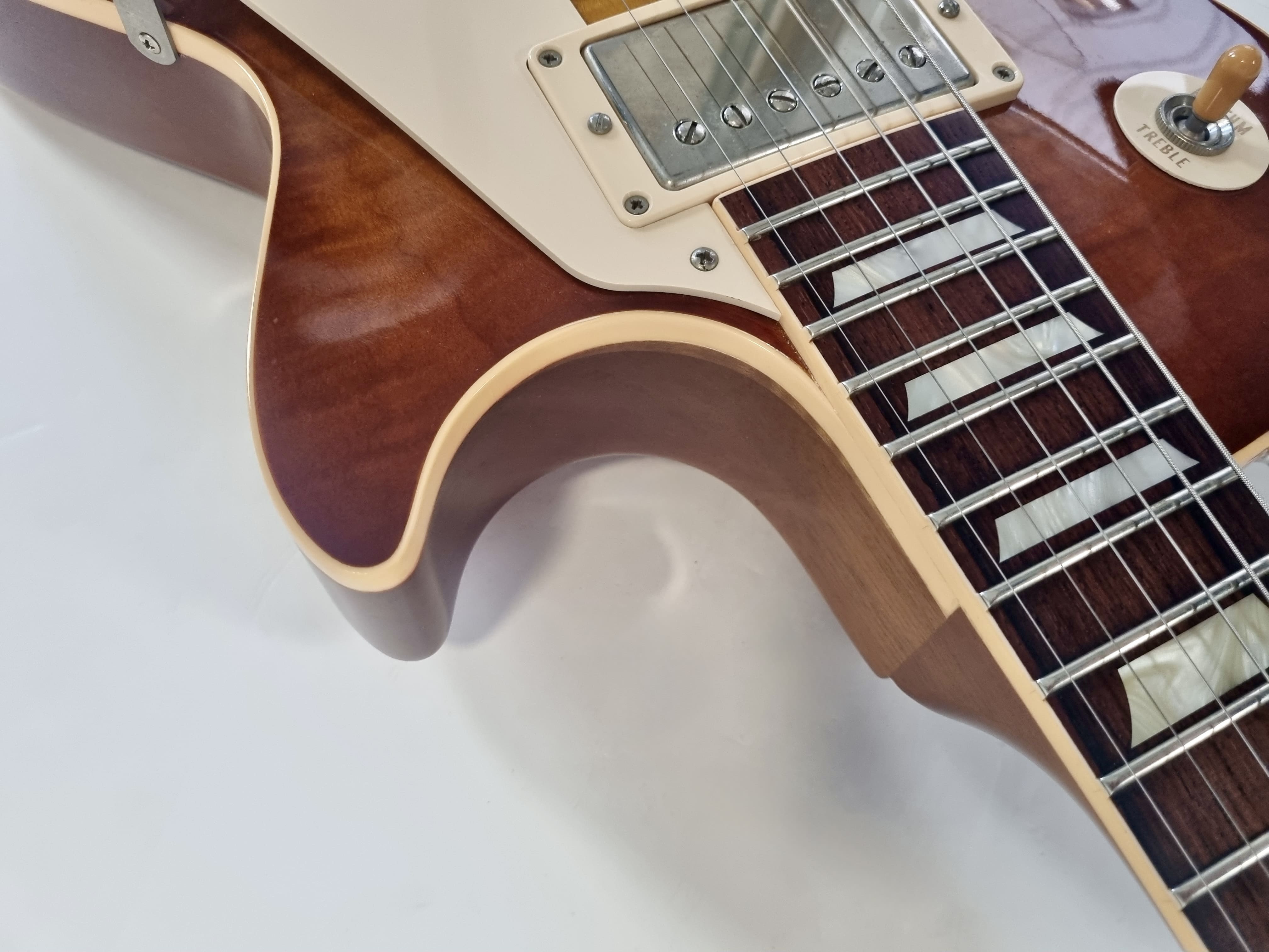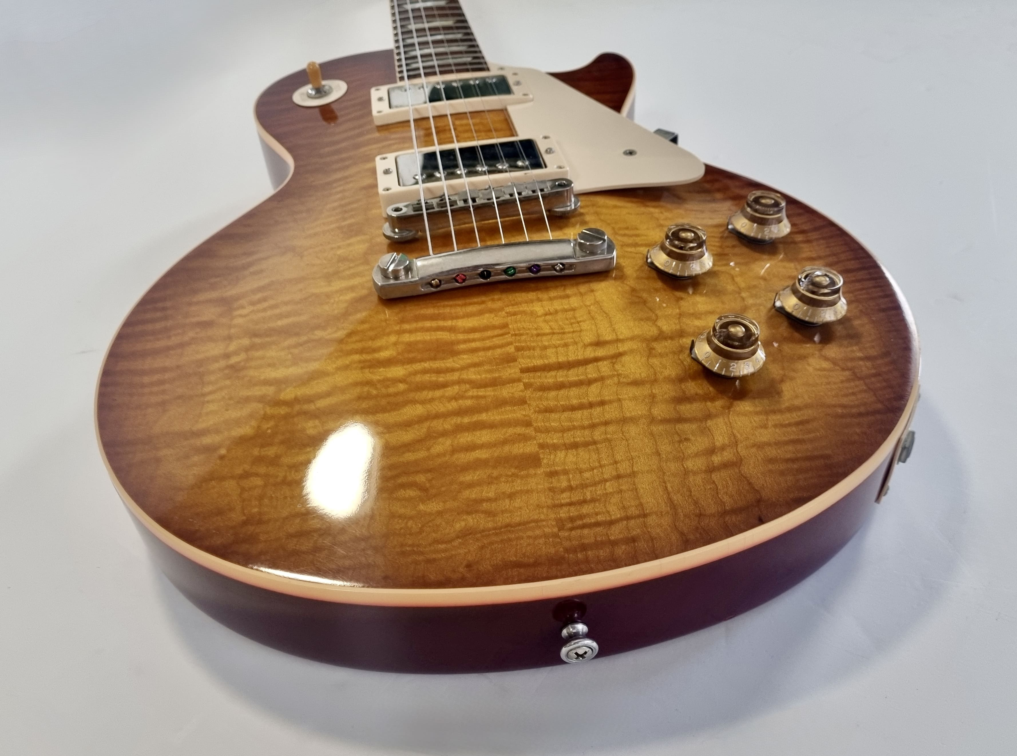 1959 is undoubtedly the most iconic year for Gibson… This R9 features a mahogany neck that sits right in the middle—neither too thick nor too slim. The maple top on this one is beautifully figured with a nice flame. The body is also made of mahogany, and the rosewood fingerboard has a 12-inch radius. This Custom Shop model is equipped with Burstbucker 1 and 2 pickups. It is sold with its original case and certificate of authenticity. More pix and details upon request. Shipping worldwide available.