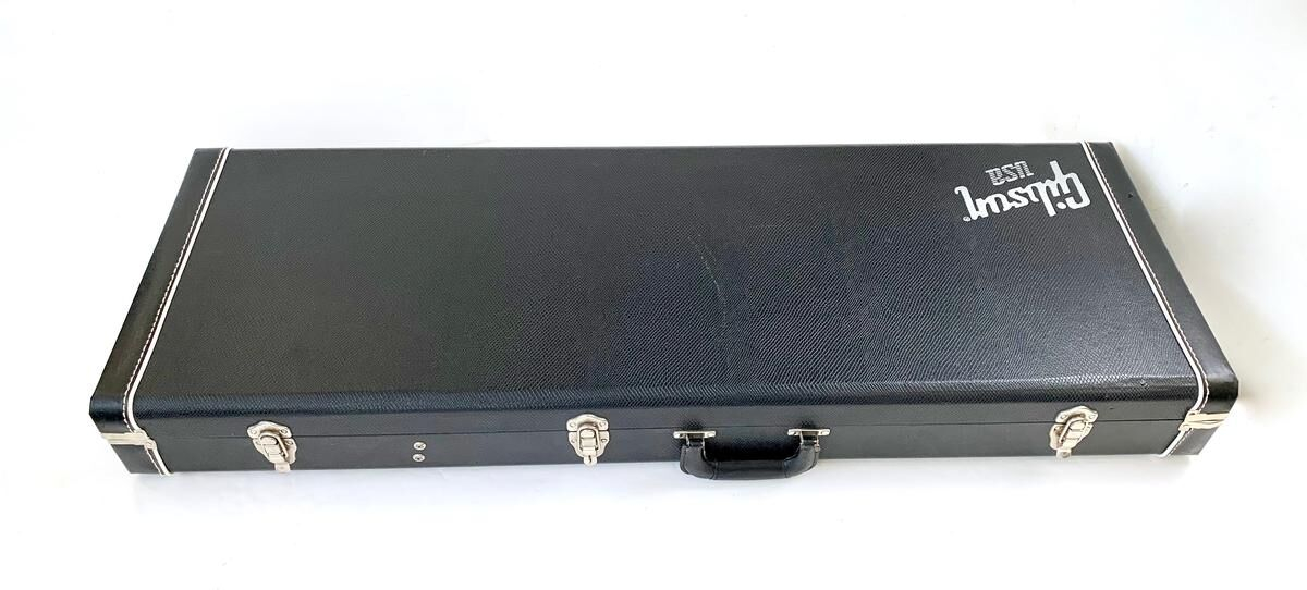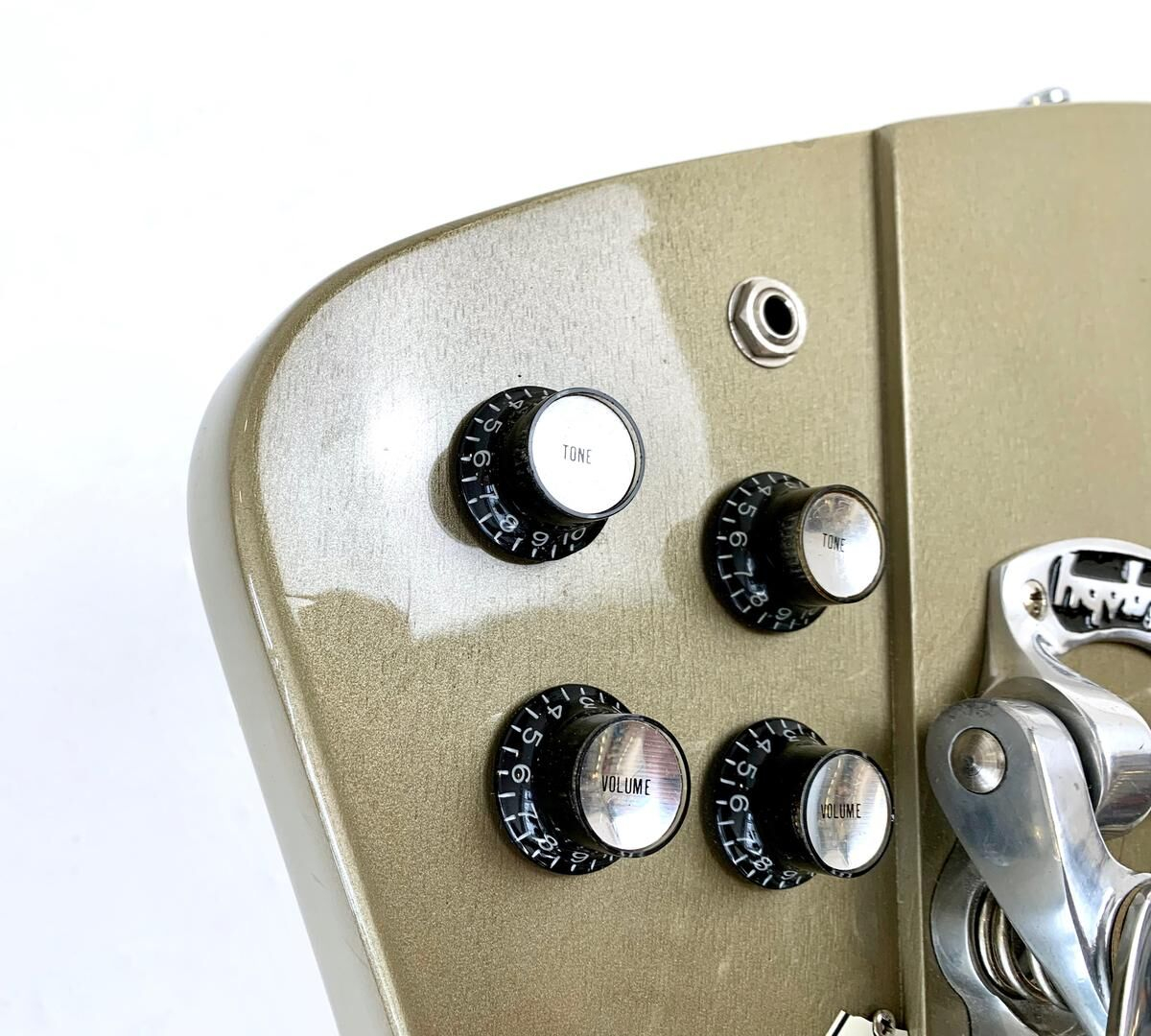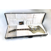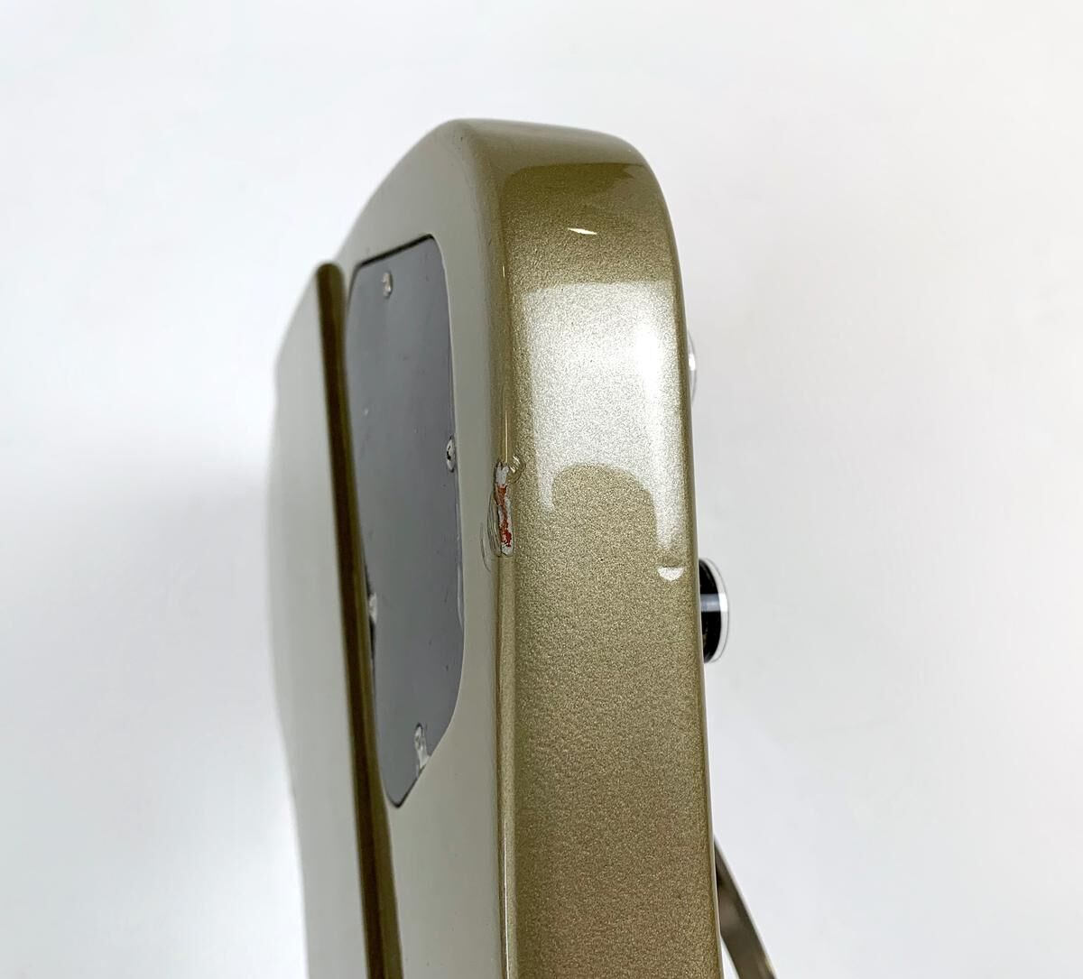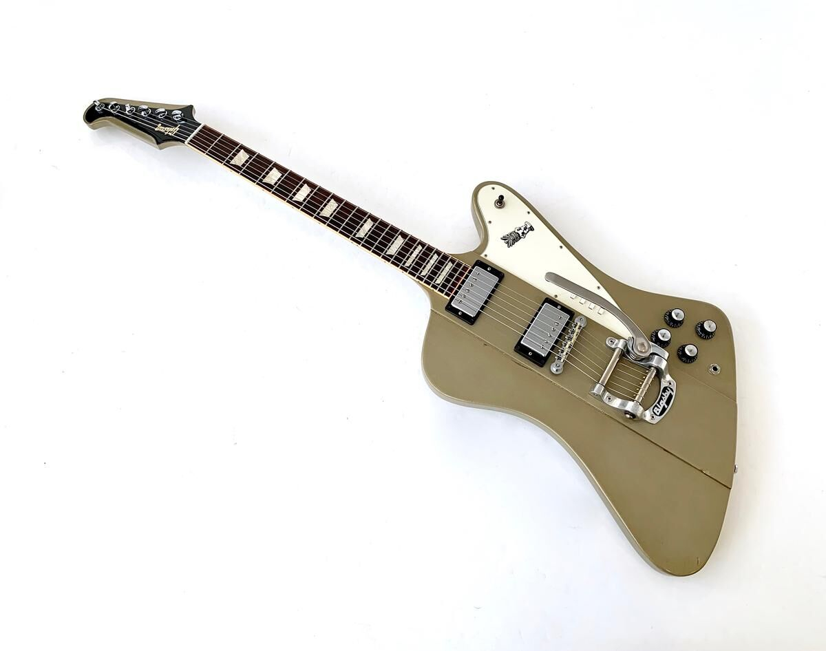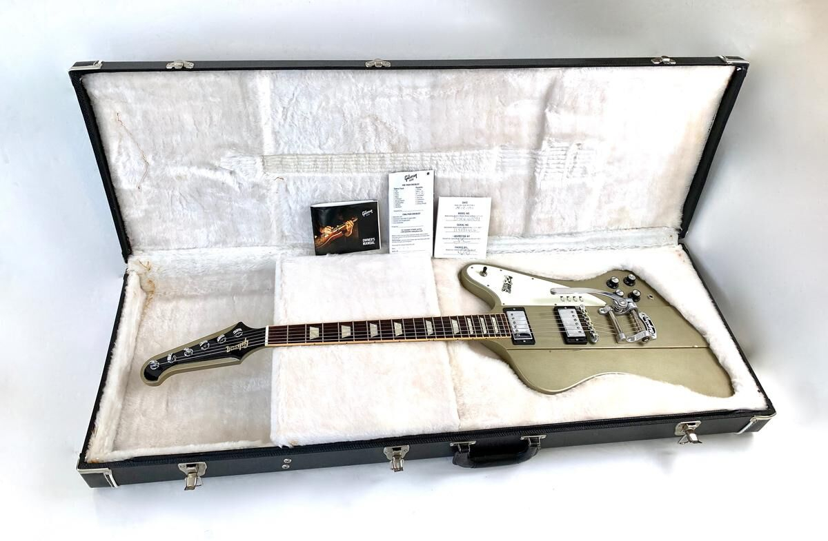 Au début de sa carrière en 1963, la Firebird a un corps dit « reverse » mais à partir de 1965, celui-ci devient « non reverse ». Voici le modèle signature Elliot Easton du groupe The Cars qui est spécial à bien des égards ! En effet les micros sont des Classic 57 et elle dispose de quatre mini-switchs permettant de splitter, de mettre en position hors-phase ou encore de passer le micro chevalet directement au jack. On notera également la présence d’un Bigsby ainsi qu’une belle livrée Gold Mist Poly. Celle-ci est une survivante qui a été réparée après de nombreuses fractures documentées sur notre dossier photo, elle est maintenant opérationnelle ! Vendue avec ses papiers dans son étui d’origine.