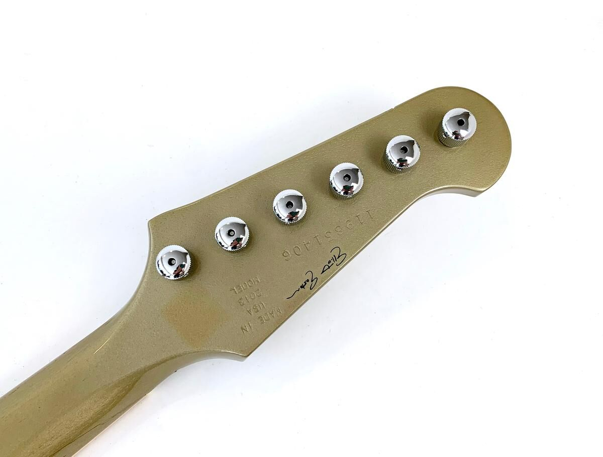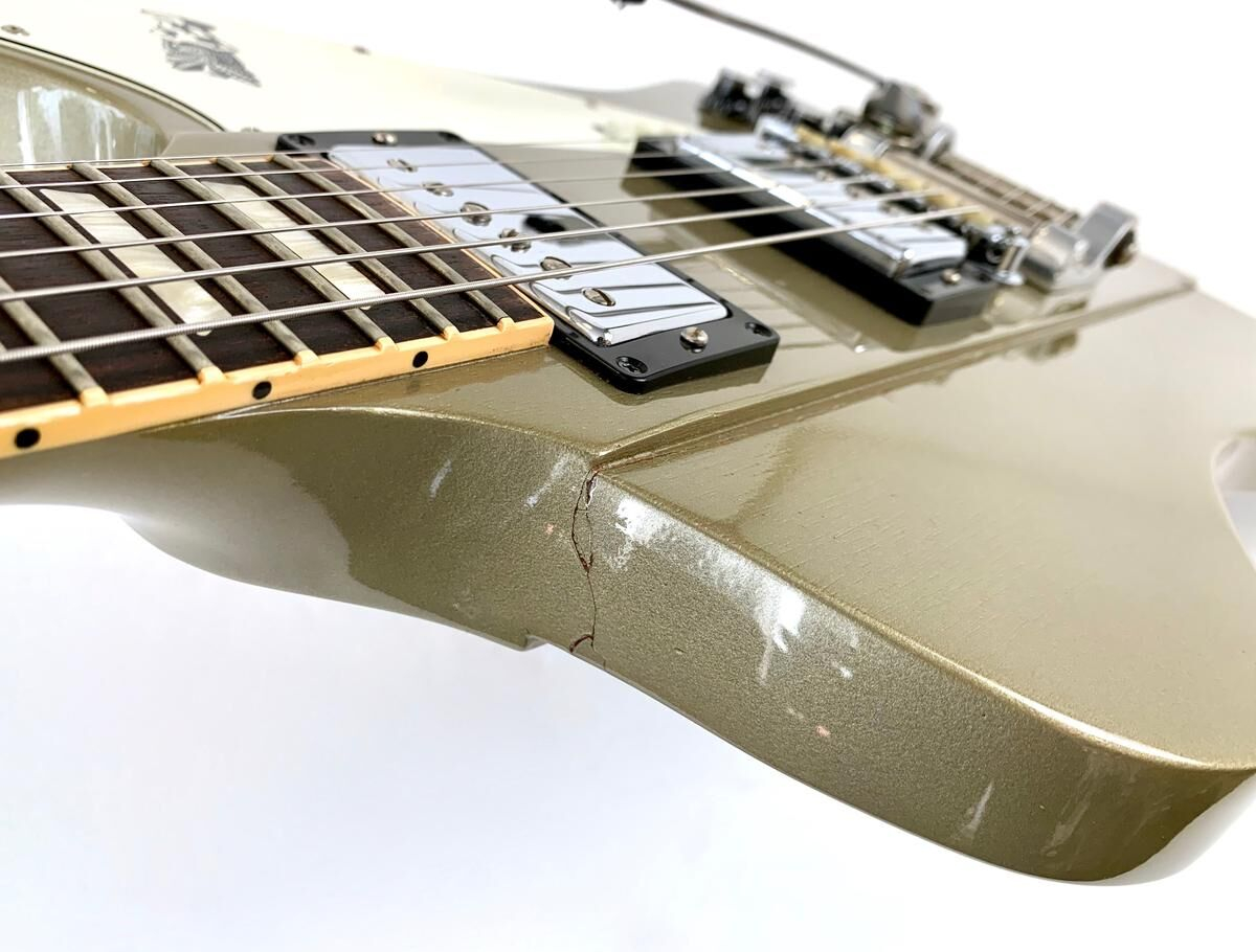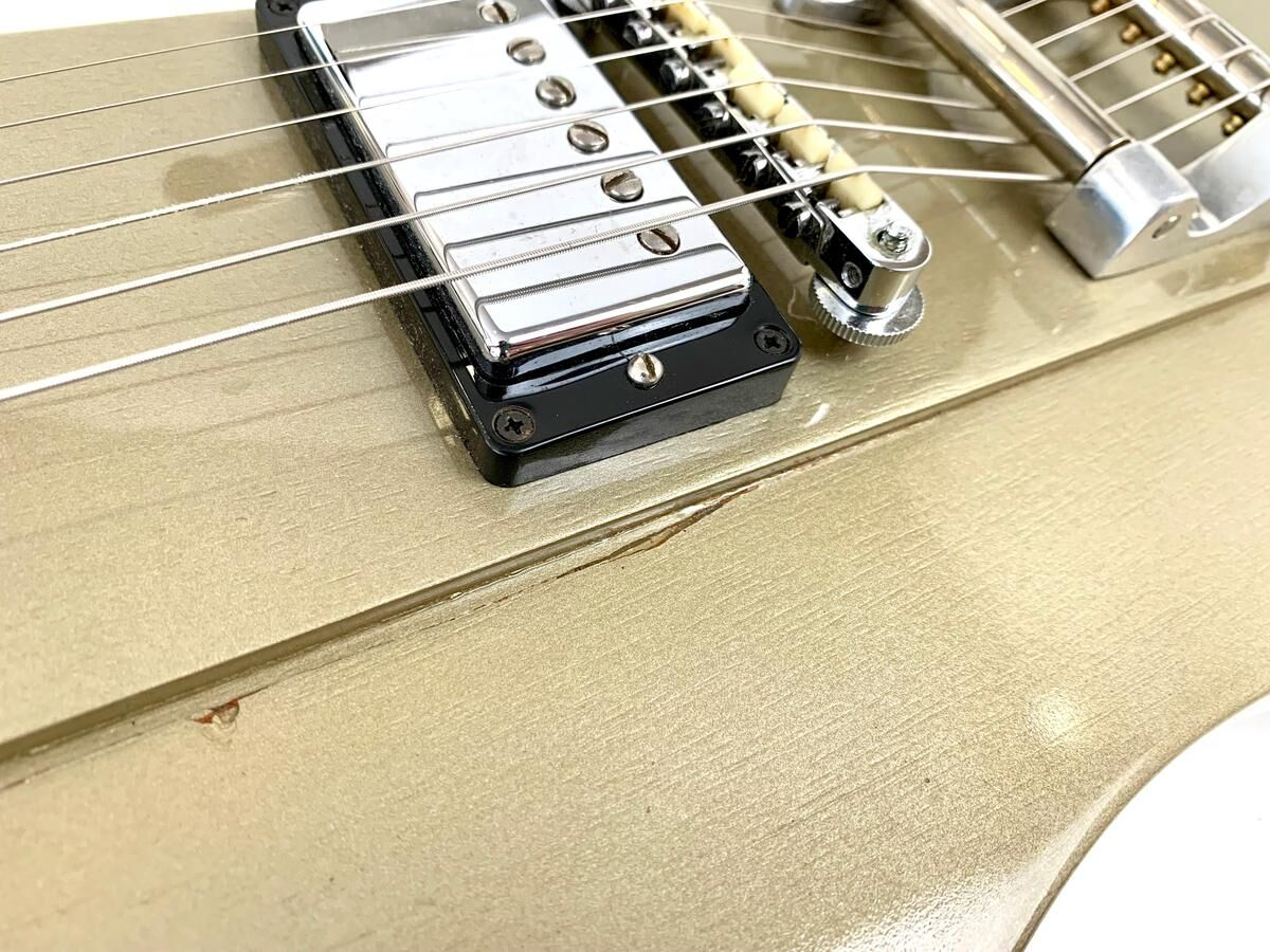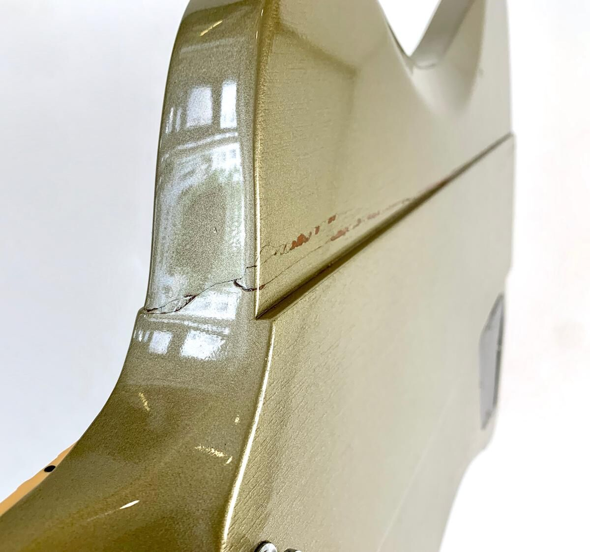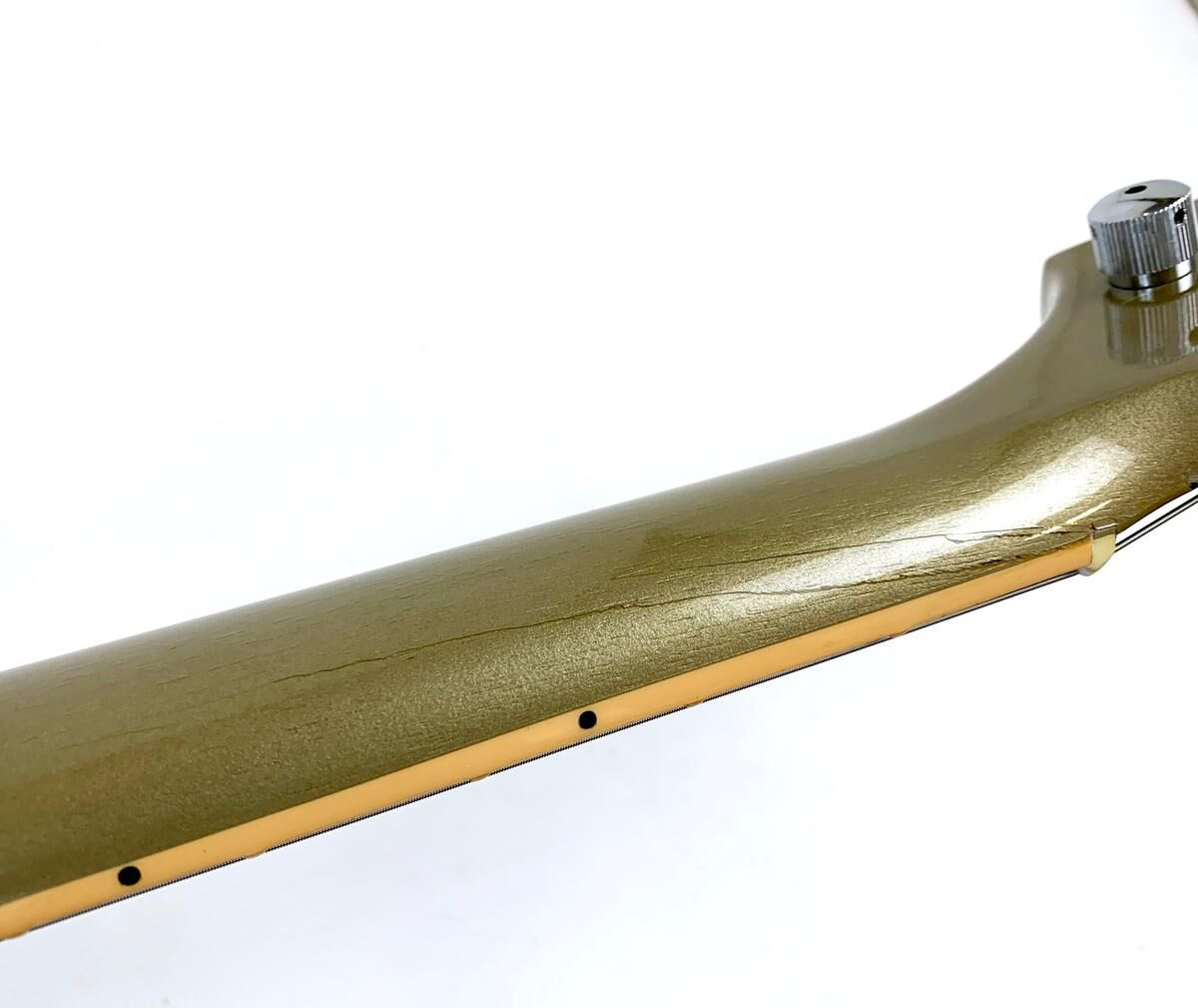 Au début de sa carrière en 1963, la Firebird a un corps dit « reverse » mais à partir de 1965, celui-ci devient « non reverse ». Voici le modèle signature Elliot Easton du groupe The Cars qui est spécial à bien des égards ! En effet les micros sont des Classic 57 et elle dispose de quatre mini-switchs permettant de splitter, de mettre en position hors-phase ou encore de passer le micro chevalet directement au jack. On notera également la présence d’un Bigsby ainsi qu’une belle livrée Gold Mist Poly. Celle-ci est une survivante qui a été réparée après de nombreuses fractures documentées sur notre dossier photo, elle est maintenant opérationnelle ! Vendue avec ses papiers dans son étui d’origine.