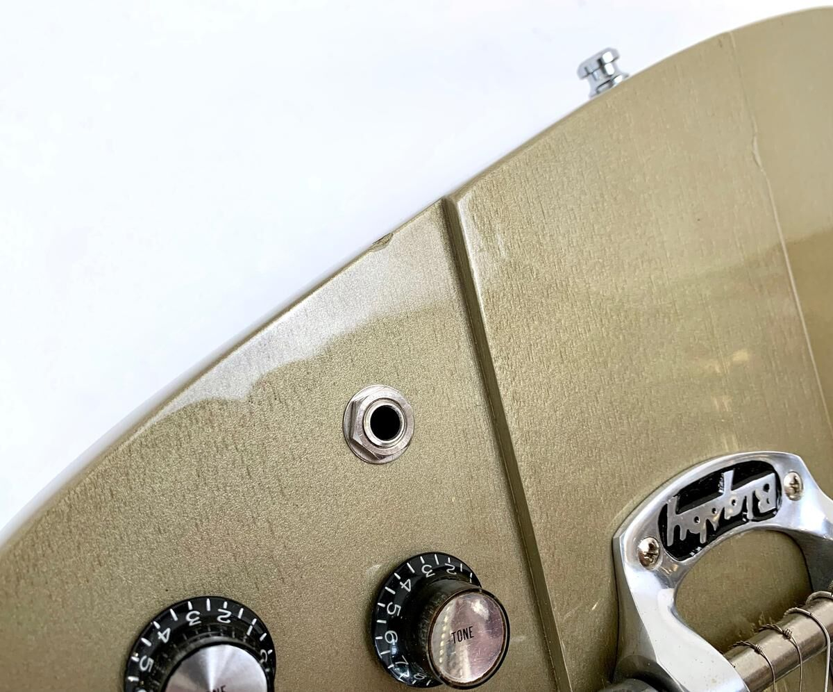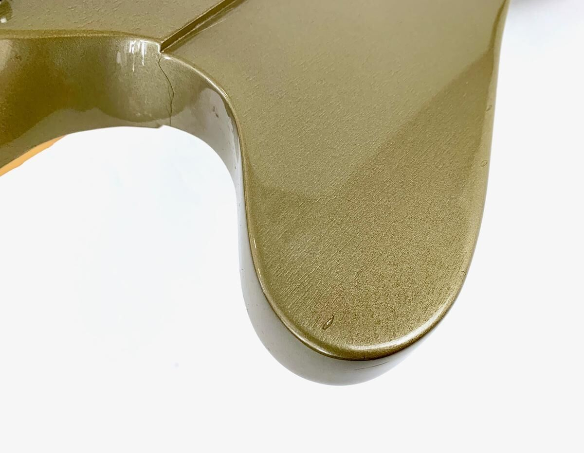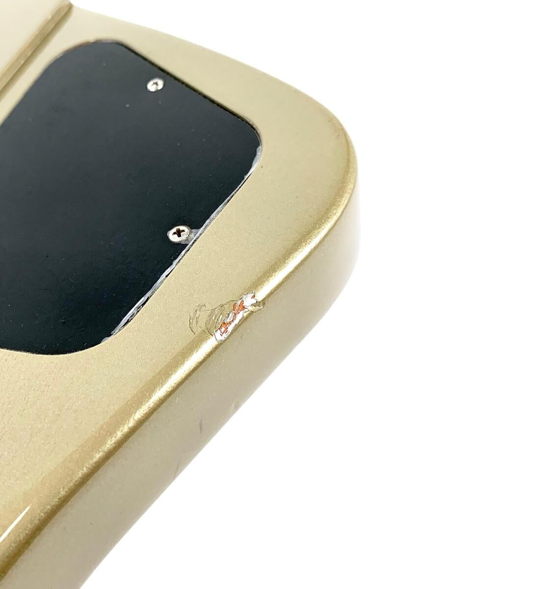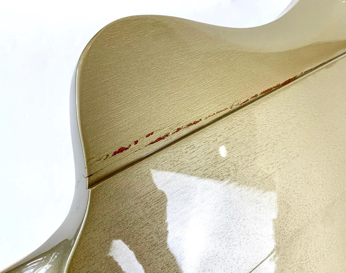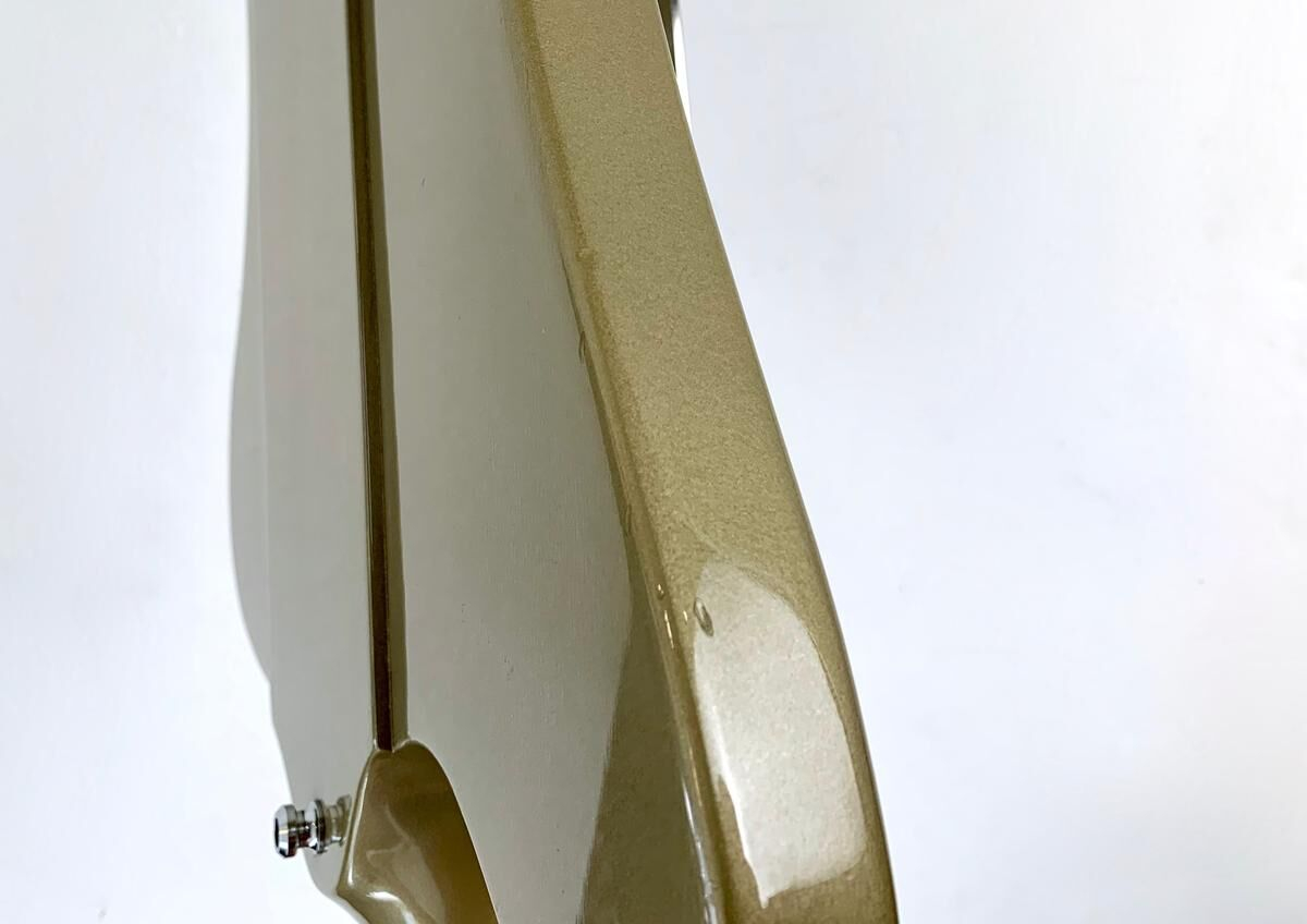 Au début de sa carrière en 1963, la Firebird a un corps dit « reverse » mais à partir de 1965, celui-ci devient « non reverse ». Voici le modèle signature Elliot Easton du groupe The Cars qui est spécial à bien des égards ! En effet les micros sont des Classic 57 et elle dispose de quatre mini-switchs permettant de splitter, de mettre en position hors-phase ou encore de passer le micro chevalet directement au jack. On notera également la présence d’un Bigsby ainsi qu’une belle livrée Gold Mist Poly. Celle-ci est une survivante qui a été réparée après de nombreuses fractures documentées sur notre dossier photo, elle est maintenant opérationnelle ! Vendue avec ses papiers dans son étui d’origine.