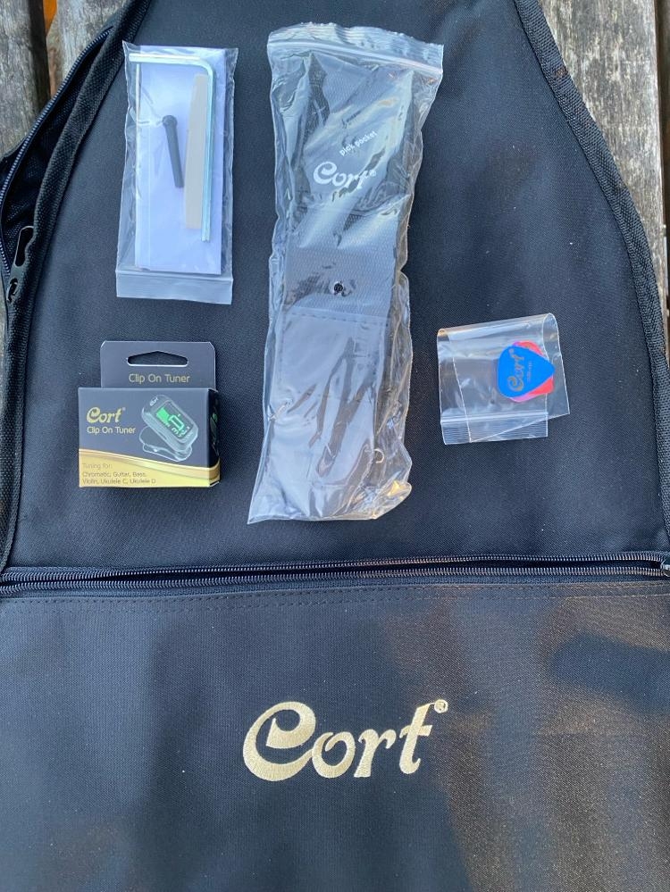 Acoustic Guitar Kit that includes:- a case- picks- a strap- an electronic tuner- a simple and easy-to-use string changing kitLiterally brand new, strings never used and still in their packaging. Furthermore, the instrument is in impeccable condition (still in its protective case).Ps: The receipt can also be provided.