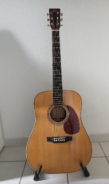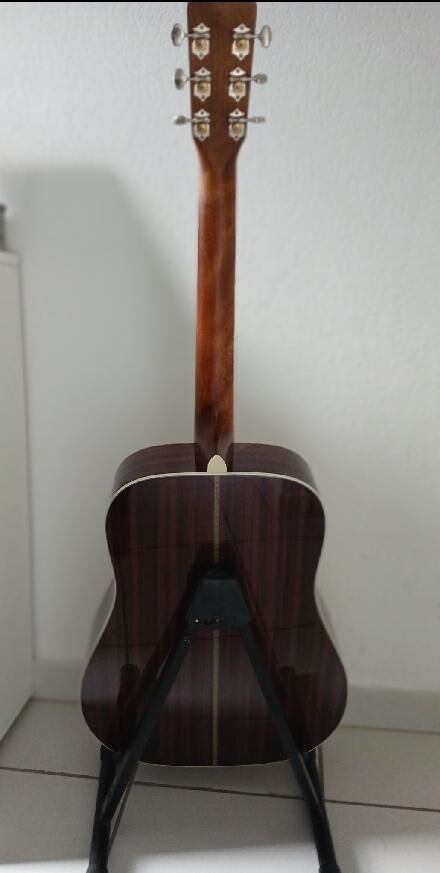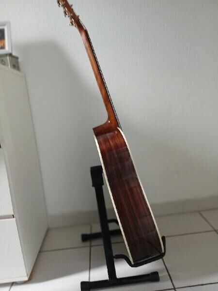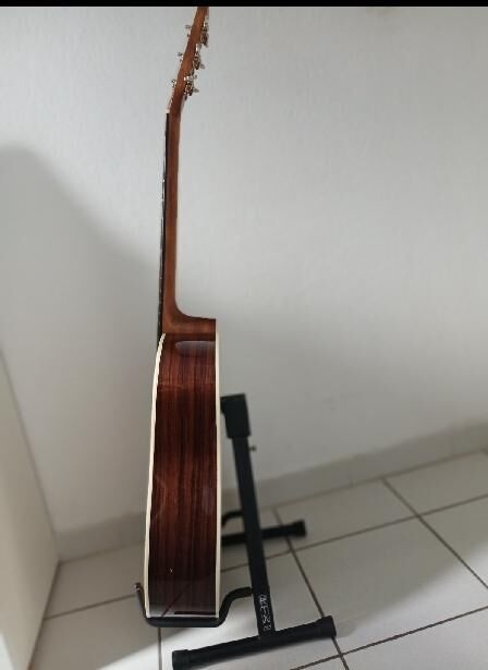 Estado nuevo con una pequeña marca de 0,5 mm de diámetro en el lado derecho (ver foto 2, lado izquierdo). Muy discreto Sigma DT-28H Dreadnought en estado impecable. Cuerdas recientes. Tapa: abeto macizo de Sitka. Fondo y aros: caoba. Mástil: caoba. Diapasón: Micarta. Cejuelas: hueso. Clavijas: Grover niqueladas