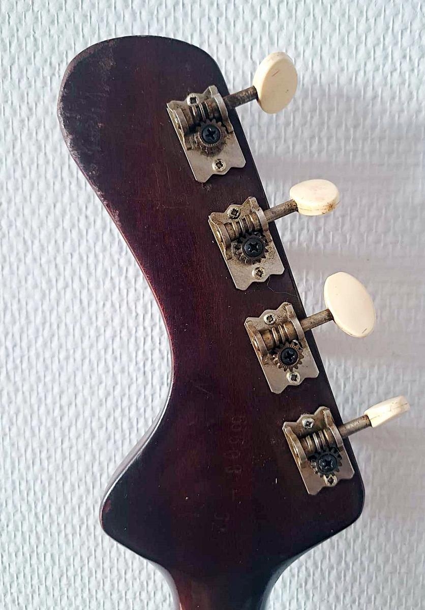 Algunas marcas de desgaste y golpes, clavijas reemplazadas por otras clavijas de Starbass de la época, pero en buen estado considerando su antigüedad. Mástil recto, trastes en buen estado.