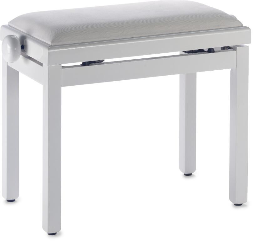 Banqueta de piano, color blanco brillante, con cojín de terciopelo blanco.