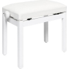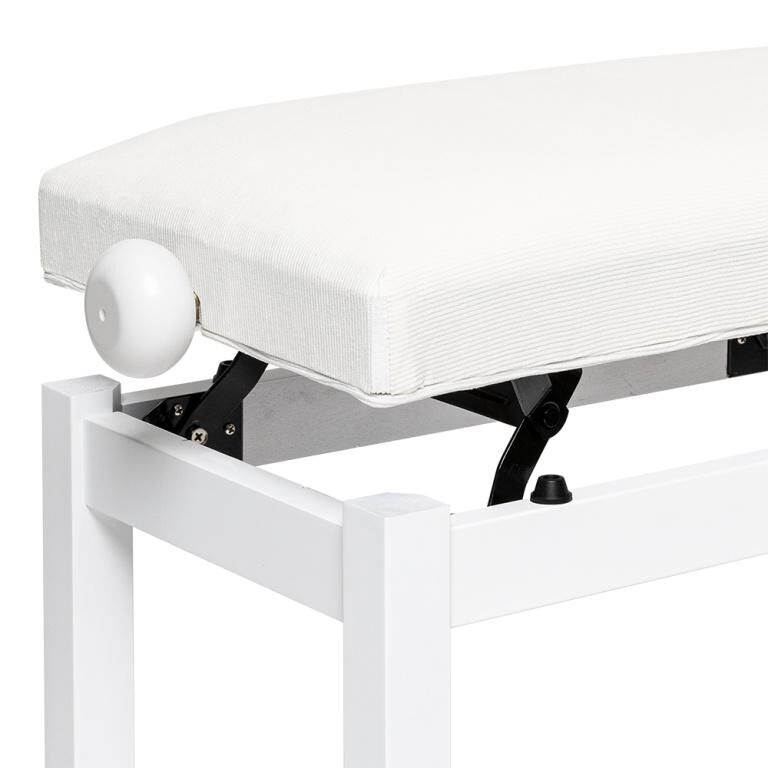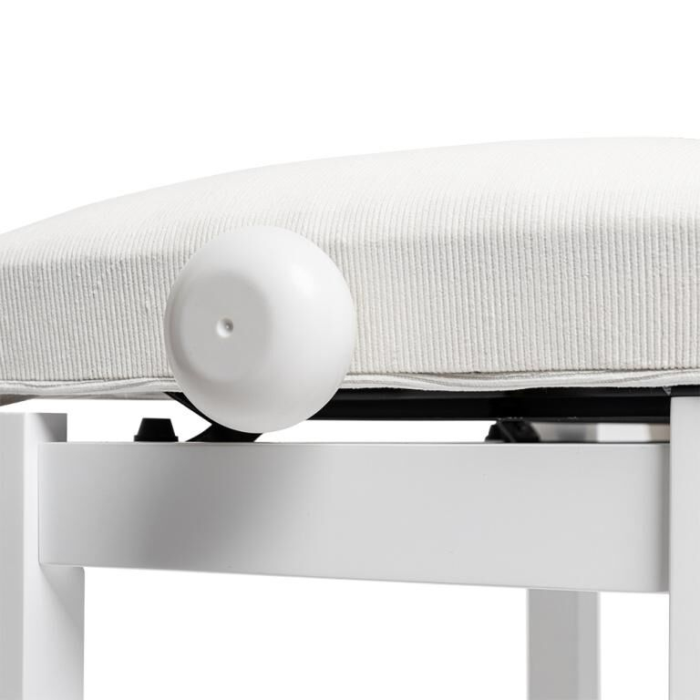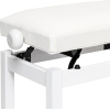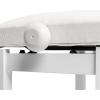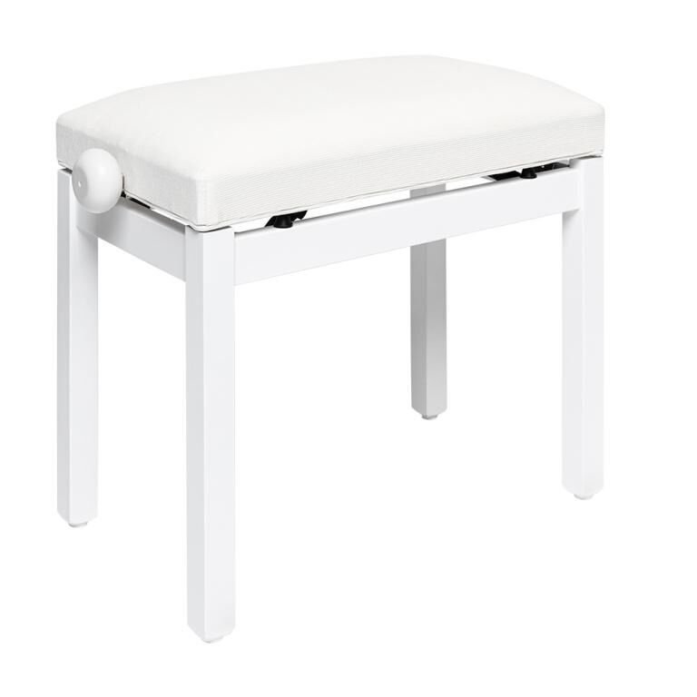 Banco de piano, acabado blanco mate, con cojín de terciopelo blanco.