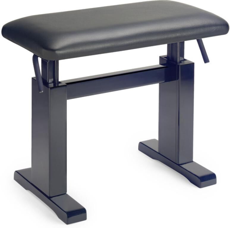 Taburete hidráulico en acabado negro mate para piano con revestimiento de cuero negro ignífugo.