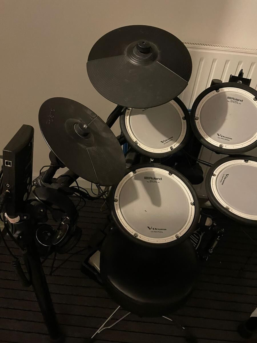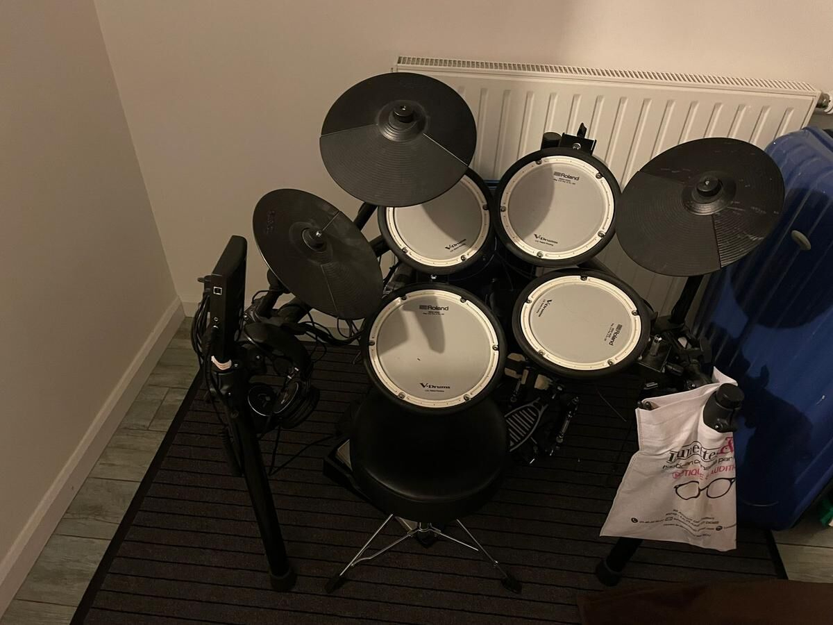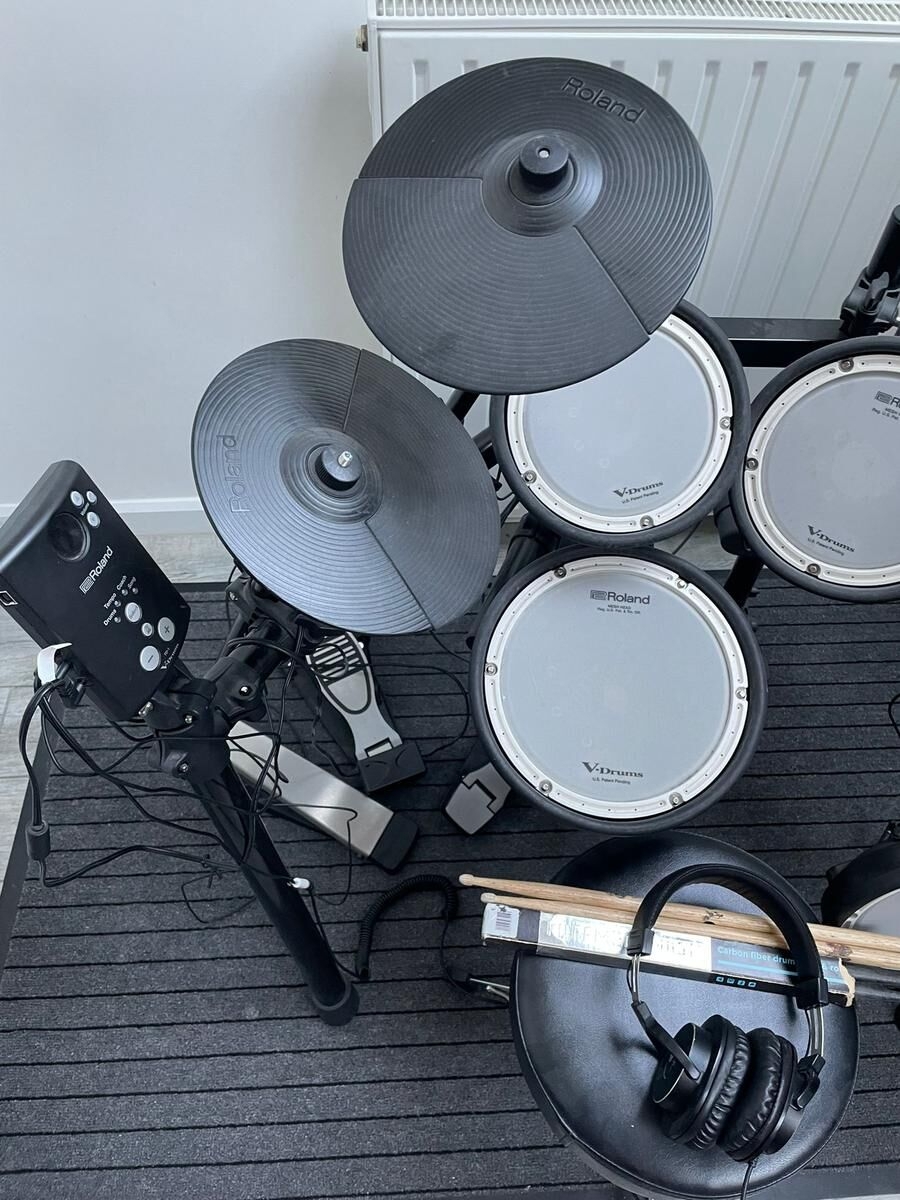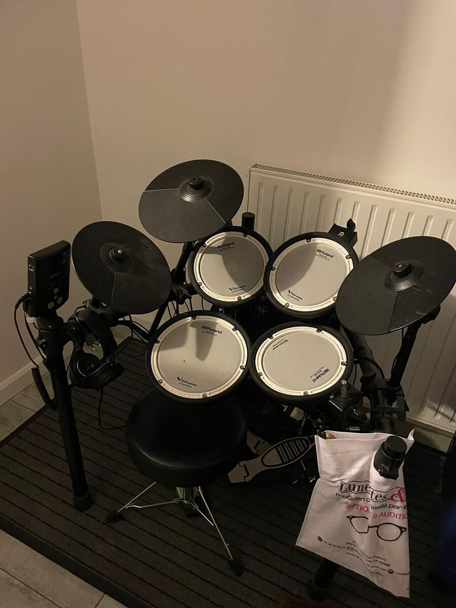Vendo batería de la marca Roland TD-1DMK compuesta por un doble pedal y un juego de dos baquetas.