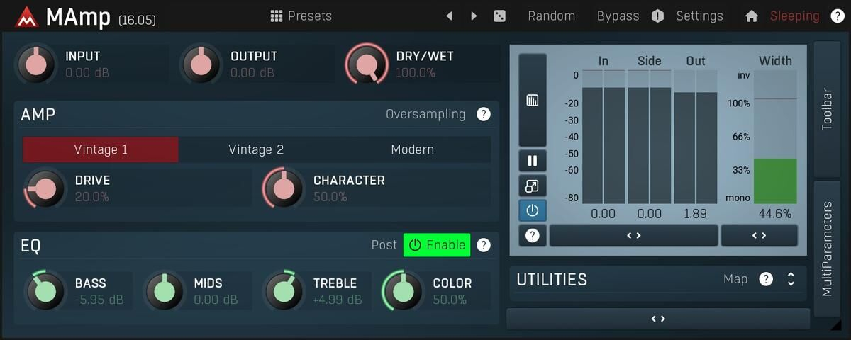 MAmp es un amplificador vintage con un sonido excelente. Ya sea que busques una saturación suave para realzar el contenido armónico o una distorsión creativa de gran calidad, MAmp es la herramienta ideal para el trabajo.