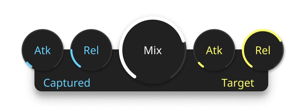 Solo se necesitan cuatro parámetros para controlar el nivel de compresión. El ataque y la liberación para la Envoltura de Entrada (azul) describen qué tan detallada debe ser capturada la señal original. El ataque y la liberación para la Envoltura Objetivo (amarilla) determinan el ajuste a realizar. Valores de ataque más largos resultan en una reducción del transitorio, mientras que valores de liberación más largos realzan el sustain y la liberación.