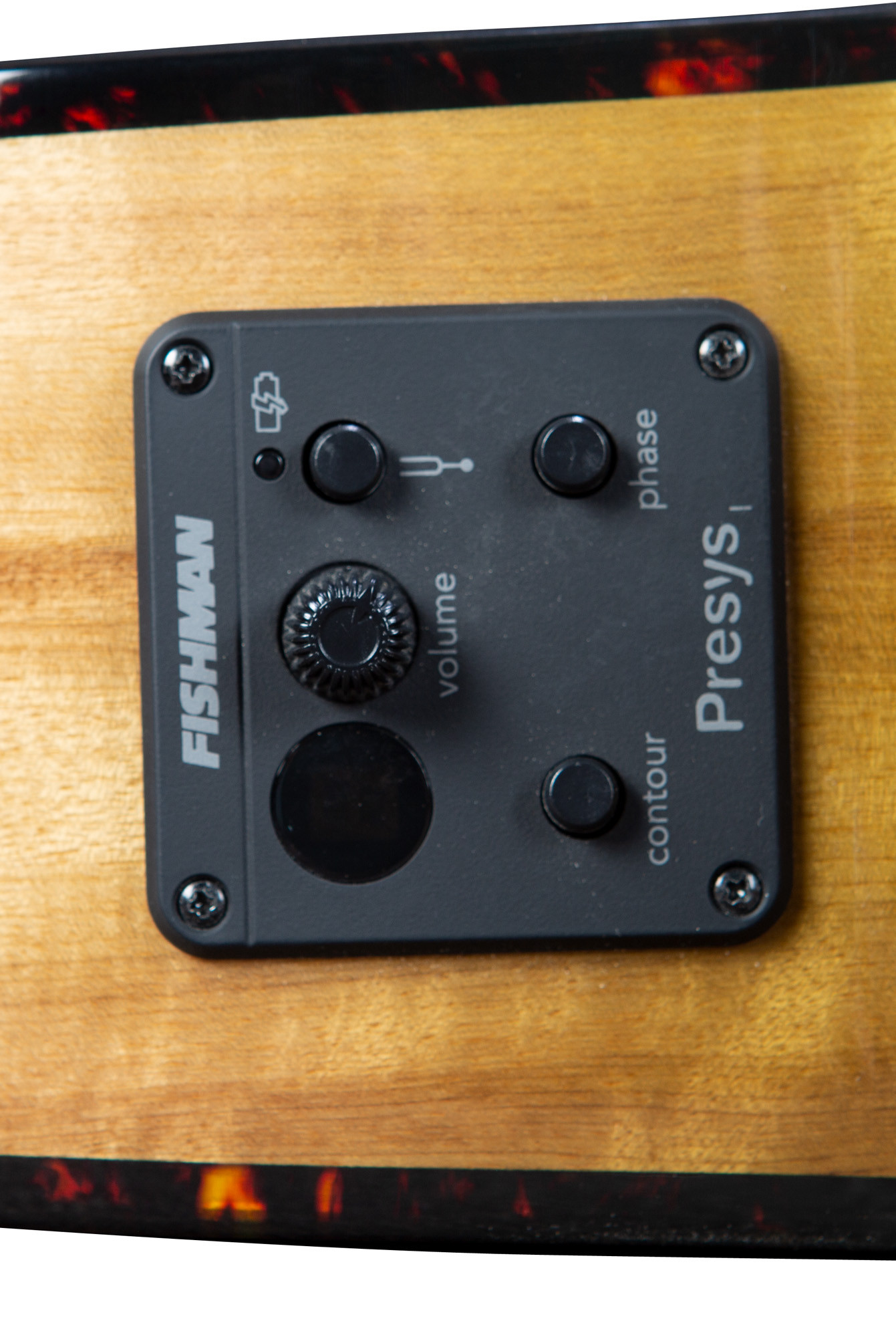 Se distingue por la combinación de myrtlewood macizo, el cutaway, una comodidad de ejecución bien pensada y un sistema de preamplificación Fishman Presys I, lo que lo convierte en una opción coherente para quienes desean un instrumento a la vez estético, práctico y listo para la amplificación.