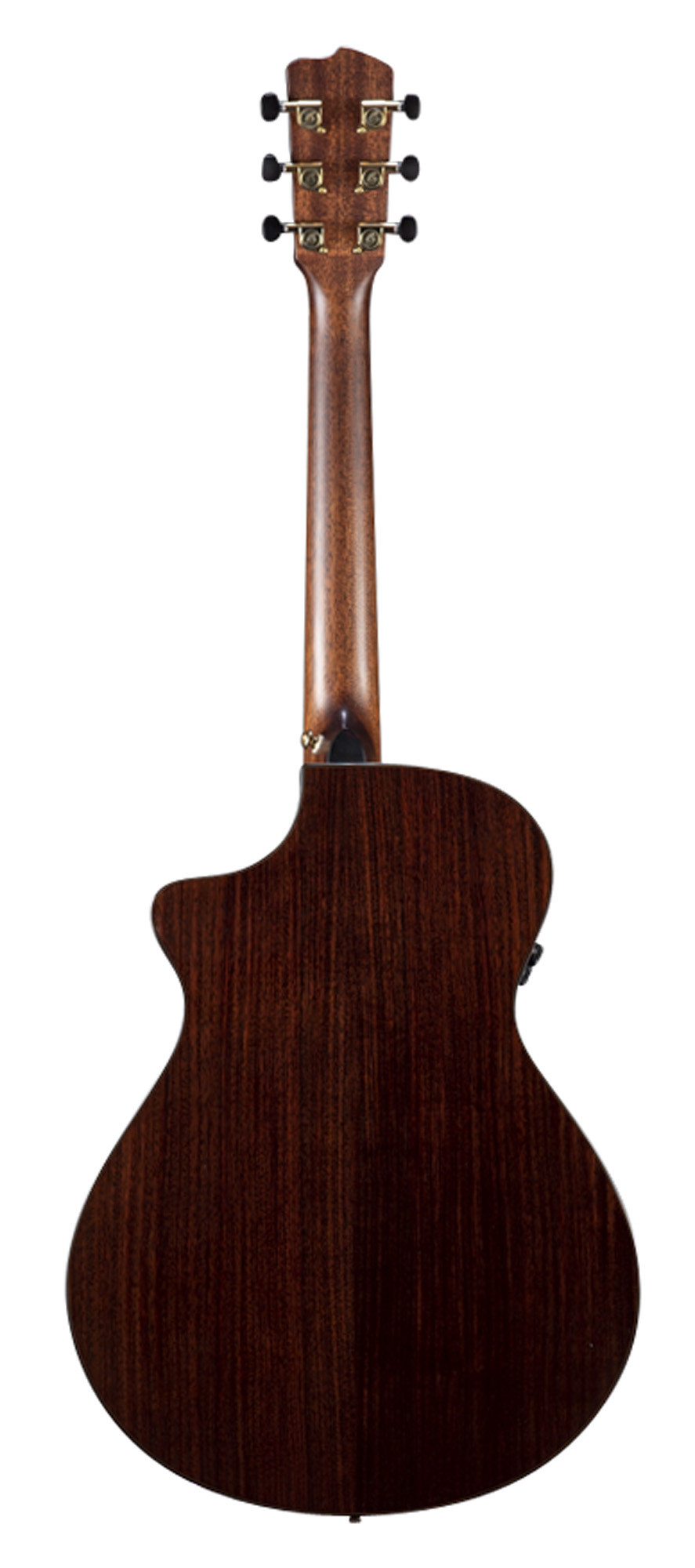 Este modelo en formato Concertina destaca por su cuidada construcción y sus maderas de alta gama. Cuenta con tapa de abeto europeo macizo, fondo y aros de palisandro indio macizo, así como mástil de caoba. Su cutaway facilita el acceso a las notas agudas, mientras que su escala de 43 mm y su diapasón de ovangkol garantizan una comodidad de ejecución óptima. Las incrustaciones “offset dots” de latón, el binding tortoise y las cejuelas Tusq aportan un acabado elegante y preciso. Está equipado con clavijeros dorados Premium Breedlove, cuerdas D’Addario XT PB Light y un sistema Fishman Flex Plus-T, y se entrega con estuche.