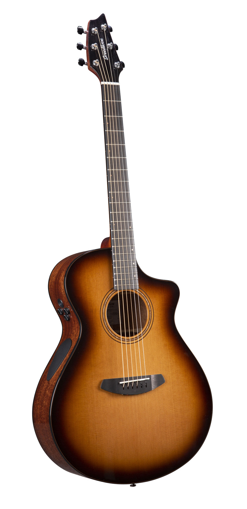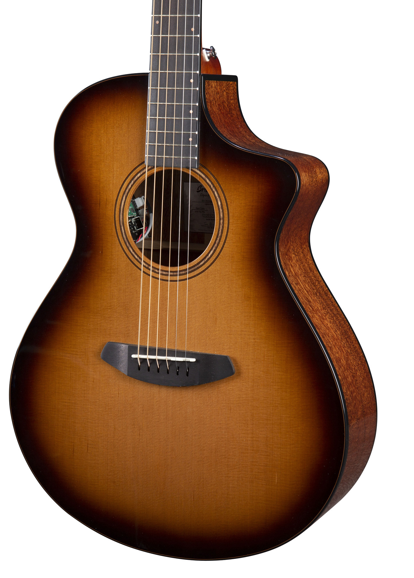 Su construcción combina una tapa de cedro rojo macizo con un fondo y aros de caoba maciza, junto con elementos como las cejas Tusq, los clavijeros Premium Breedlove y el sistema Fishman Flex Plus-T, para un conjunto completo y coherente.
