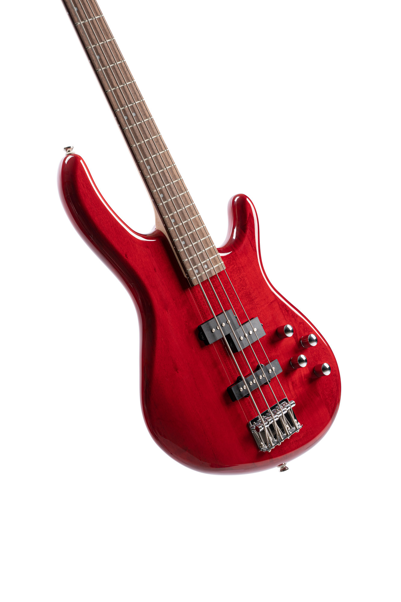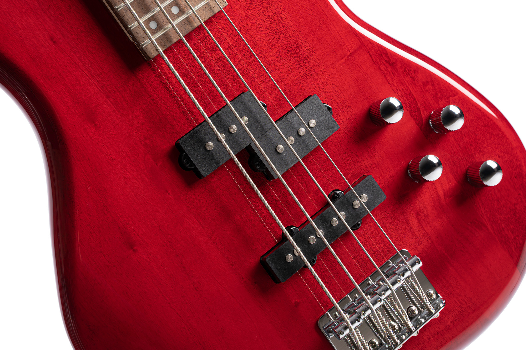 4 cuerdas, cuerpo de álamo, pastillas PJ Powersound, ecualización activa de 2 bandas, acabado rojo translúcido.