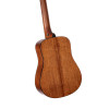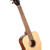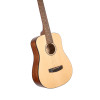 Este modelo en formato dreadnought 3/4 ofrece una escala de 579 mm, lo que lo convierte en una solución compacta y agradable de manejar. Está equipado con tapa de abeto, fondo y aros de caoba, así como un acabado natural de poro abierto. El diapasón y el puente son de merbau. El conjunto incluye 19 trastes, una cejuela de 43 mm y una roseta blanca nacarada. Se incluye una funda.