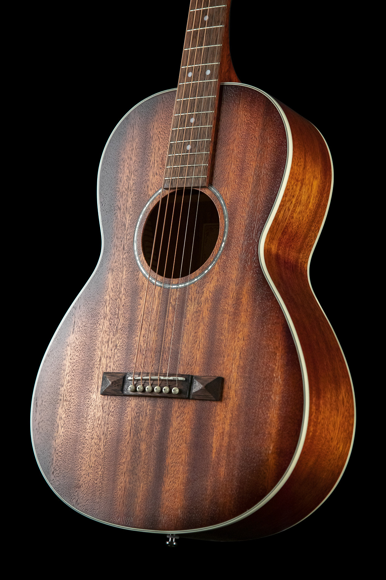 Su construcción en caoba para la tapa, el fondo, los aros y el mástil, junto con un diapasón y un puente de merbau, ofrece un diseño coherente y materiales elegidos con esmero. El acabado natural de poro abierto también refuerza su carácter visual.
