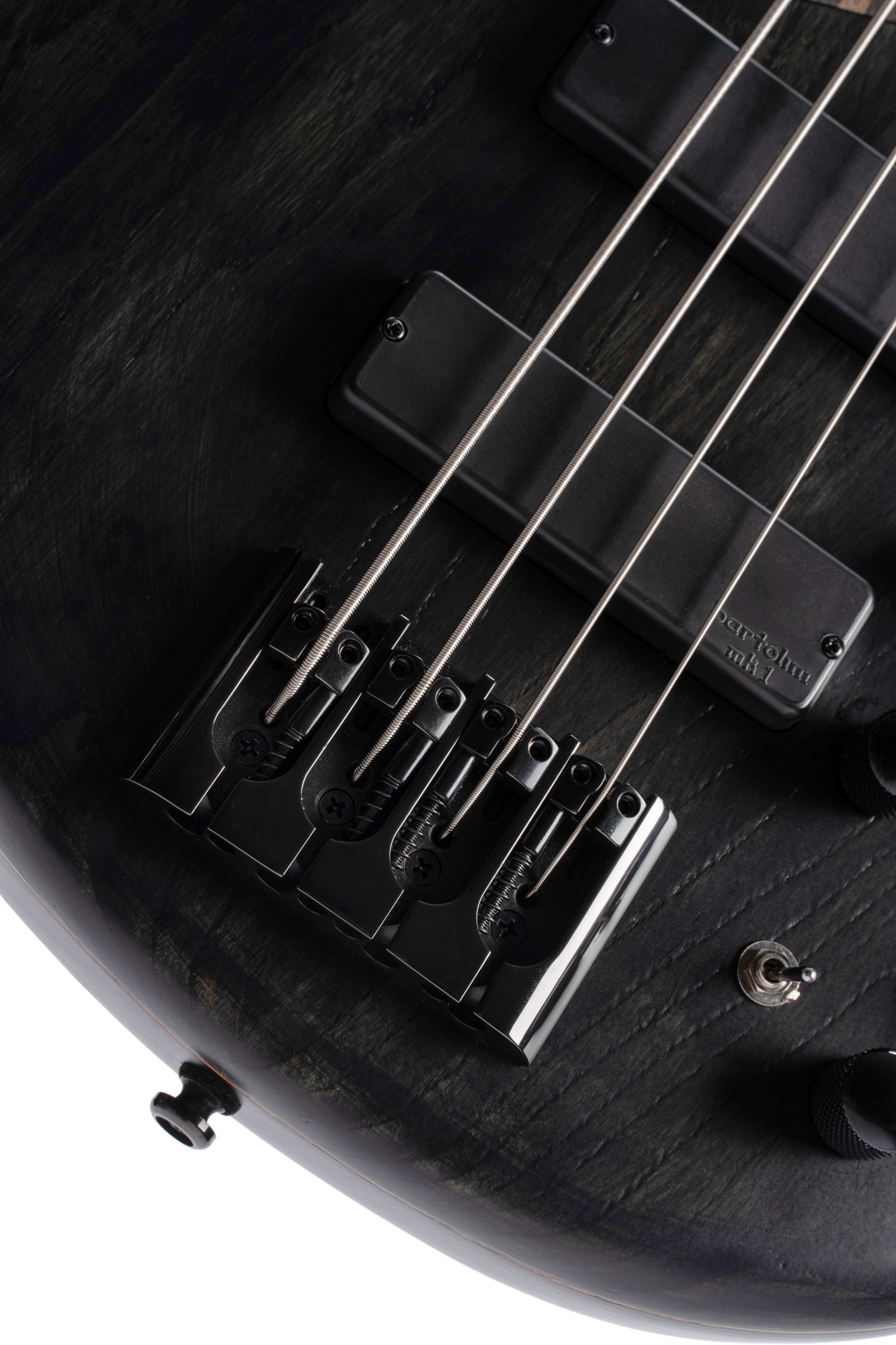 Este bajo de 4 cuerdas combina un cuerpo de caoba con una tapa de fresno, para una construcción cuidada y equilibrada. Está equipado con un diapasón de arce tostado, un mástil de 5 piezas en panga panga/nogal, dos pastillas dobles Bartolini MK-1 y un previo Bartolini MK-1. Las clavijas Hipshot Ultralite, el puente MetalCraft M4 y el hardware negro completan el conjunto. El acabado negro de poro abierto aporta un aspecto sobrio y elegante.