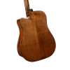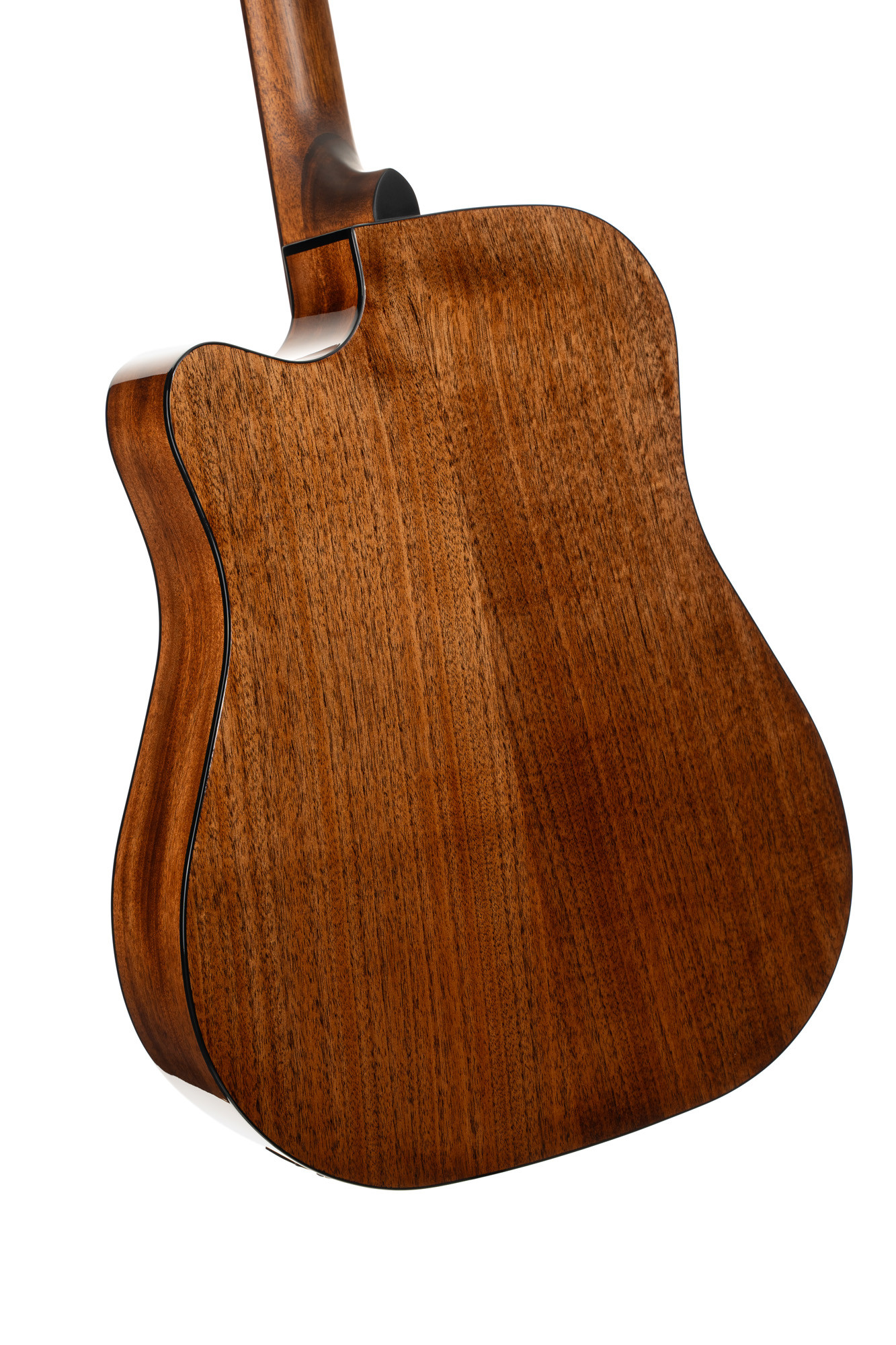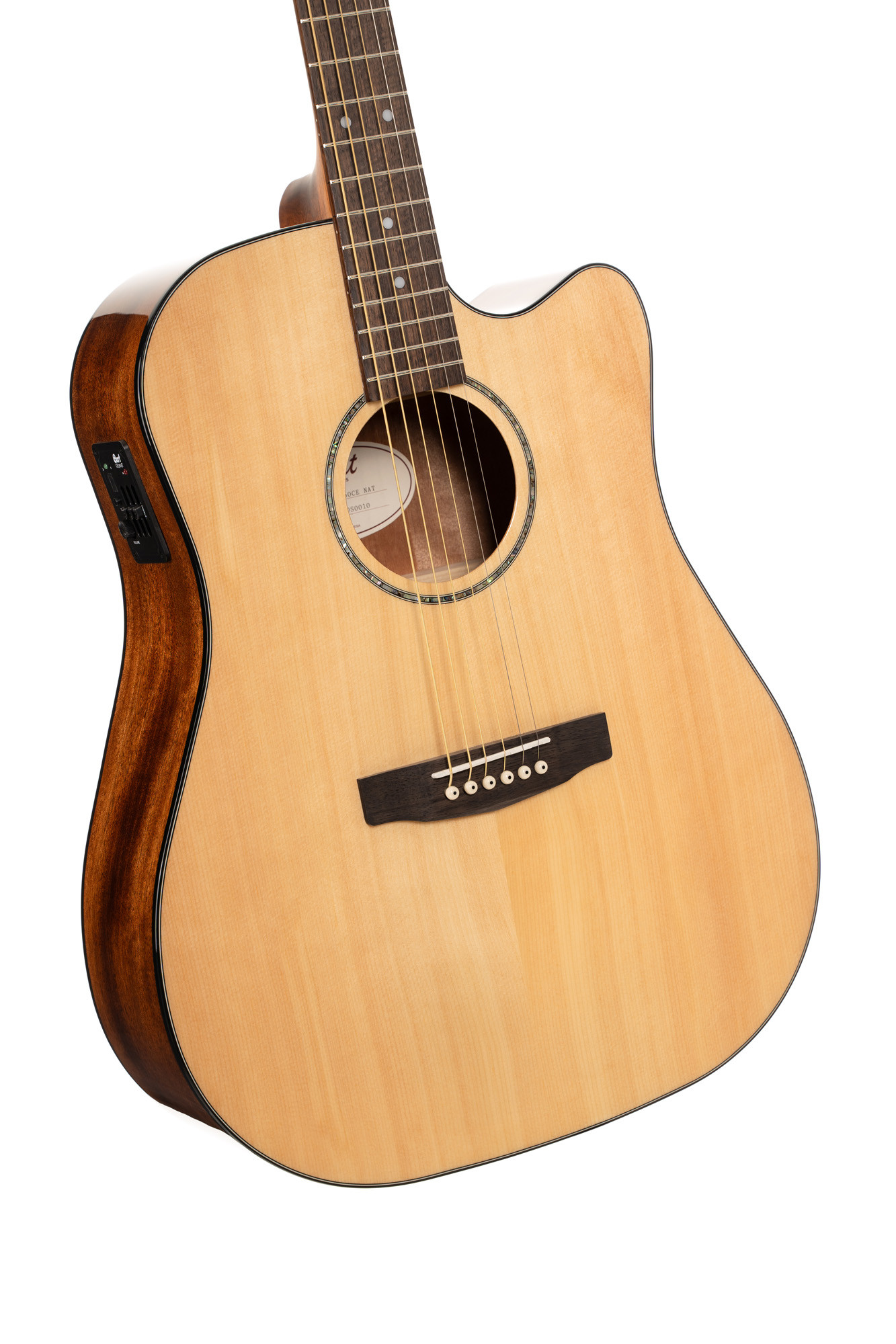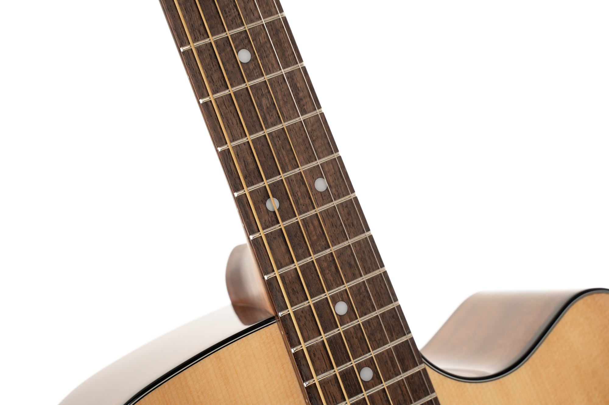 Esta guitarra electroacústica con cutaway se distingue por su tapa de abeto macizo, combinada con fondo y aros de caoba para una construcción equilibrada. Está equipada con diapasón de laurel, mástil de caoba, 20 trastes, cejuela de 43 mm, afinadores cromados de baño de aceite y un previo EQ CE304T. Su acabado natural brillante realza el aspecto de la madera al tiempo que aporta una presentación cuidada.