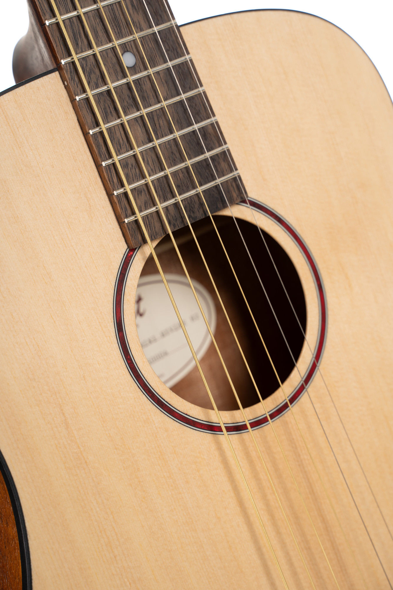 Este modelo Dreadnought 3/4 combina una tapa de abeto macizo con fondo y aros de caoba para un diseño cuidado y compacto. Dispone de mástil de caoba, diapasón y puente de laurel, así como de 20 trastes y una cejuela de 43 mm. Su acabado natural de poros abiertos realza el aspecto de la madera. Se entrega con funda.