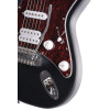 Cuerpo de álamo, mástil de arce, diapasón de jatoba, configuración de pastillas Powersound S/S/H y golpeador tortoise, acabado negro de poro abierto.