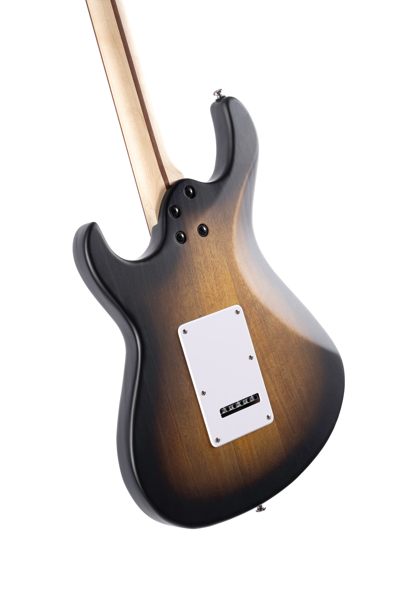 Cuerpo de álamo, mástil de arce, diapasón de jatoba, configuración de pastillas Powersound en S/S/H, placa tortoise y acabado sunburst de poro abierto.