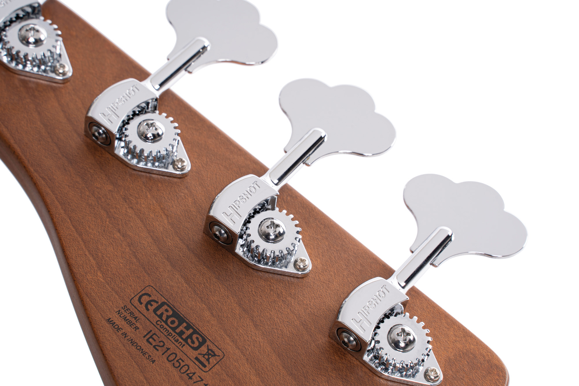 Este modelo de 4 cuerdas combina una tapa de álamo figurado con un cuerpo compuesto de arce, paulownia y fresno, para una construcción cuidada y un acabado visual natural vintage. Está equipado con mástil y diapasón de arce tostado, una escala de 34" y una cejuela de 38 mm.