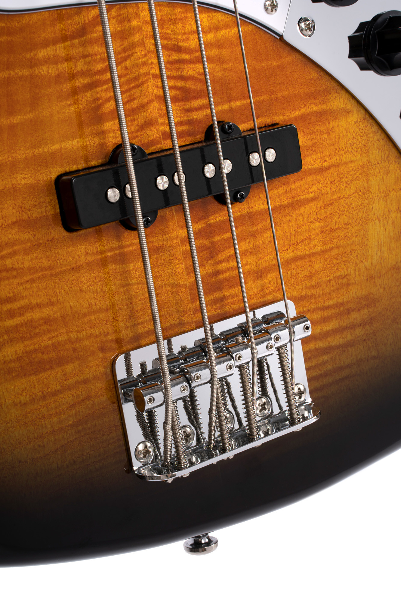 Este bajo de 4 cuerdas combina una concepción clásica con un elegante acabado sunburst de 2 tonos translúcido. Dispone de un cuerpo de álamo, una tapa de arce flameado, un mástil de arce duro y un diapasón de jatoba para una construcción cuidada y equilibrada. Con sus 20 trastes, sus 2 pastillas simples Jazz Cort Powersound y su configuración sencilla de 2 volúmenes y 1 tono, ofrece una disposición clara y práctica. También está equipado con un puente vintage, una placa blanca y herrajes cromados.