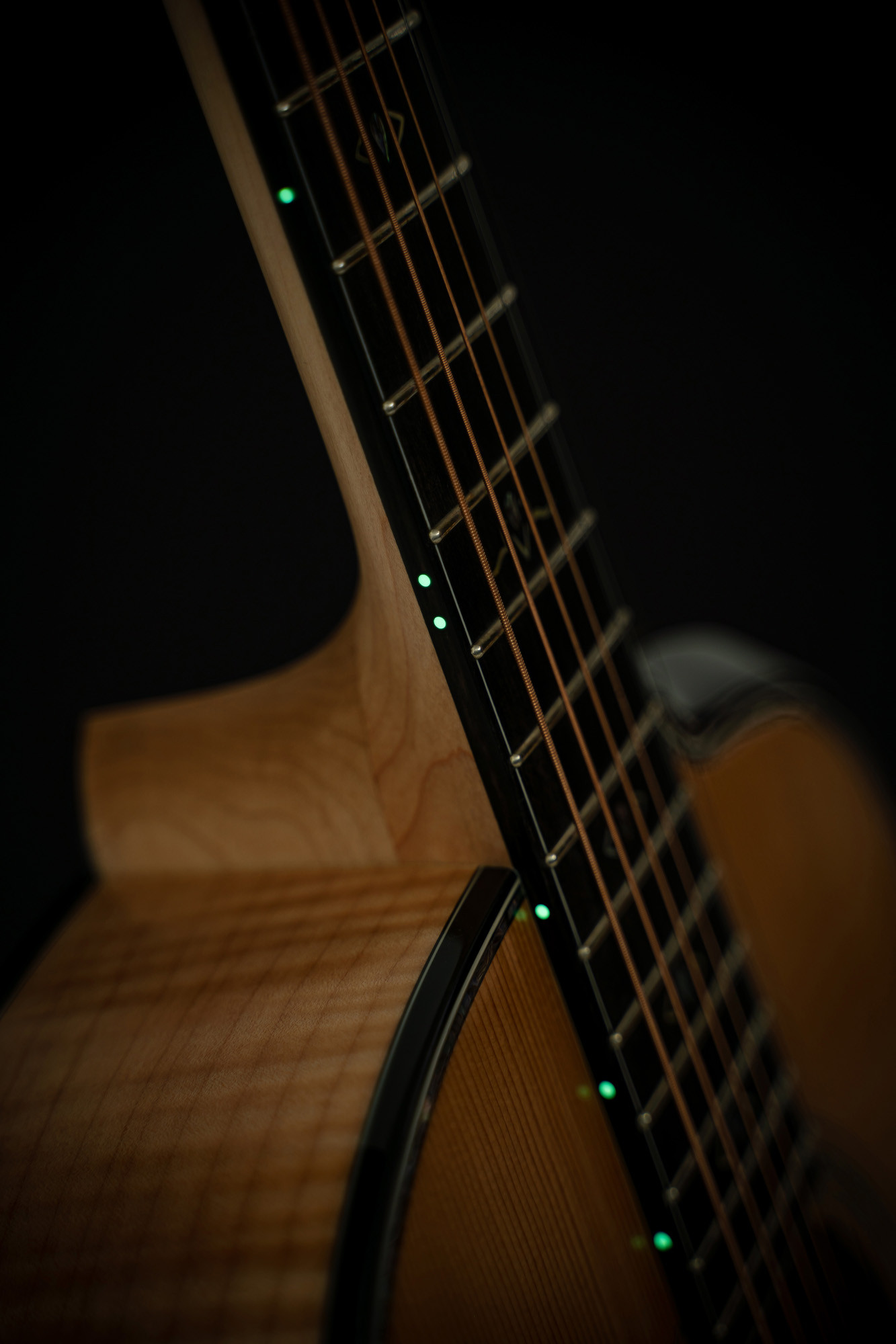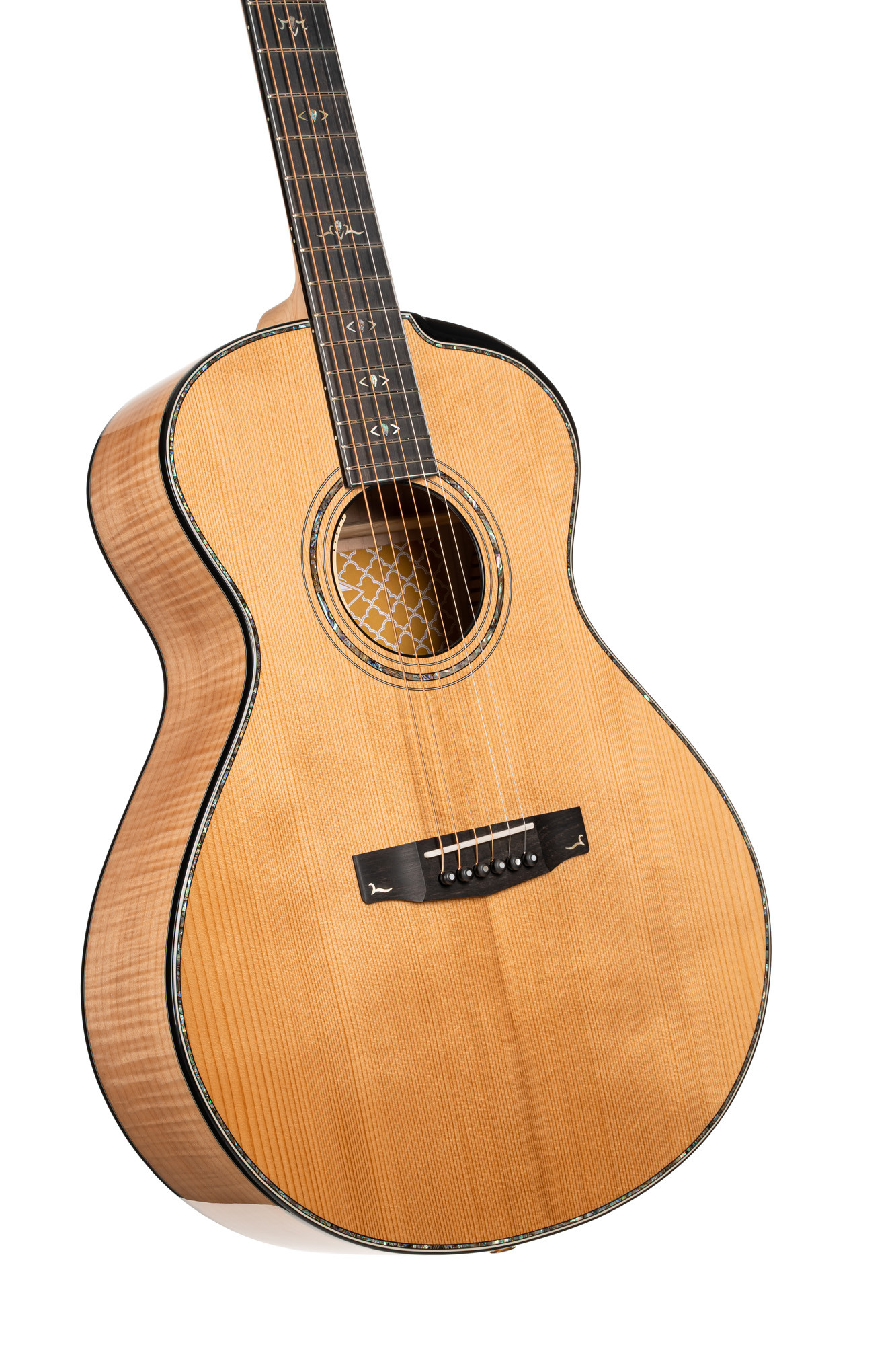 Se distingue por maderas macizas seleccionadas, una tapa de abeto Engelman tostado, fondo y aros de arce flameado AAA, cejuelas de hueso, diapasón y puente de ébano, así como electrónica LR Baggs Anthem.