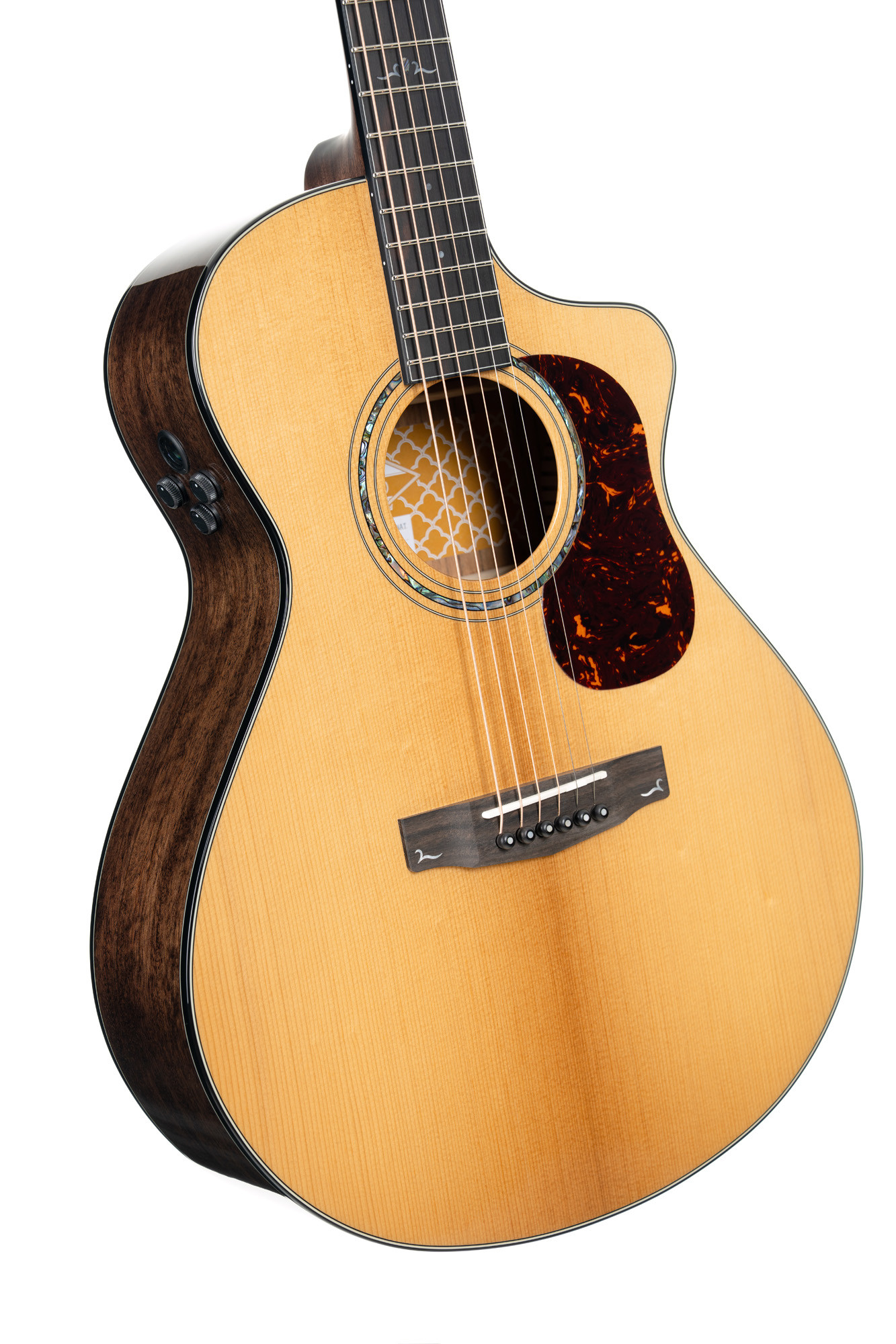 La combinación de una tapa de abeto macizo tostado, un fondo y aros de ovangkol macizo, un mástil reforzado y elementos de ébano y hueso ofrece una construcción cuidada. La electrónica Fishman y los componentes de calidad contribuyen a una experiencia fiable y homogénea.